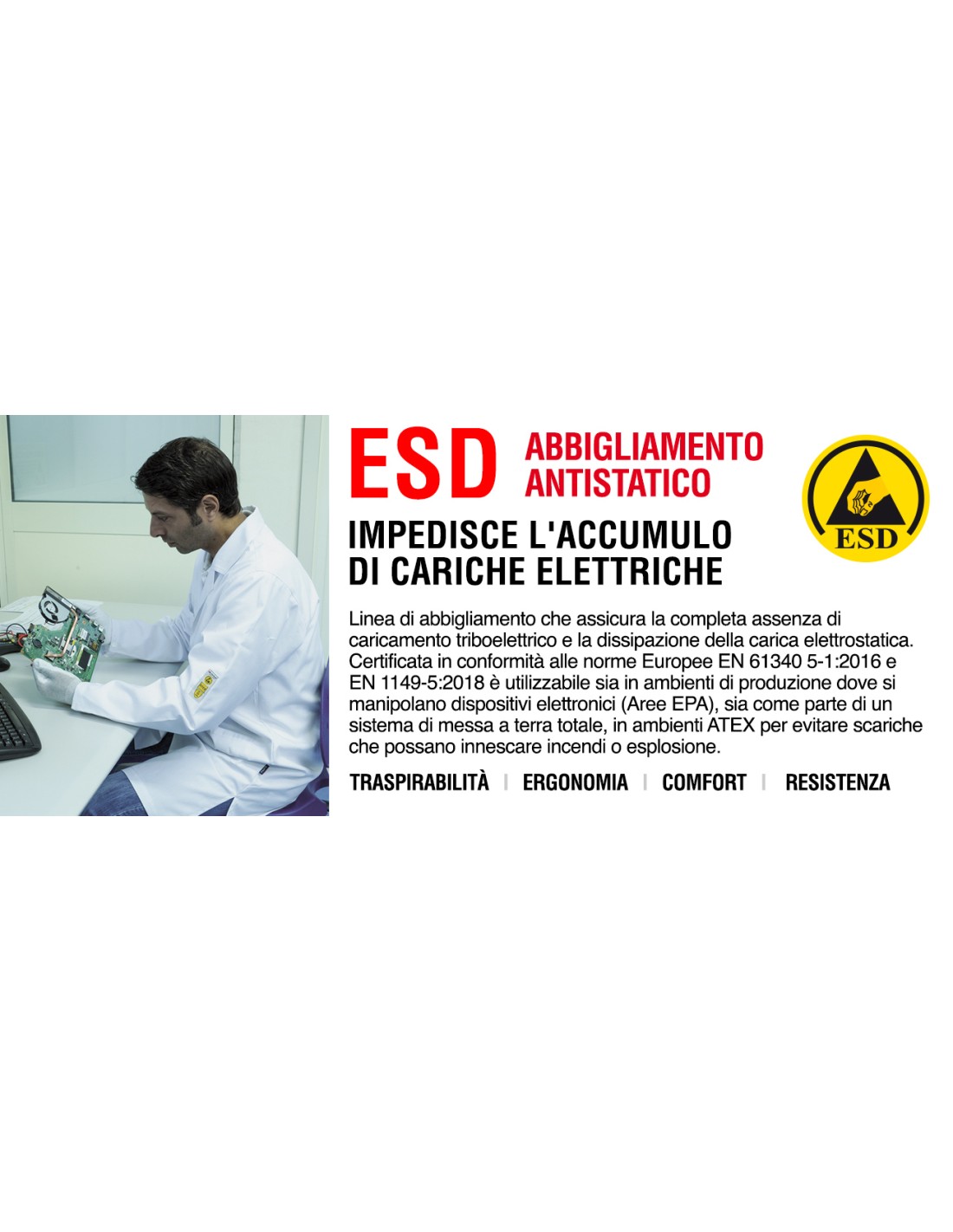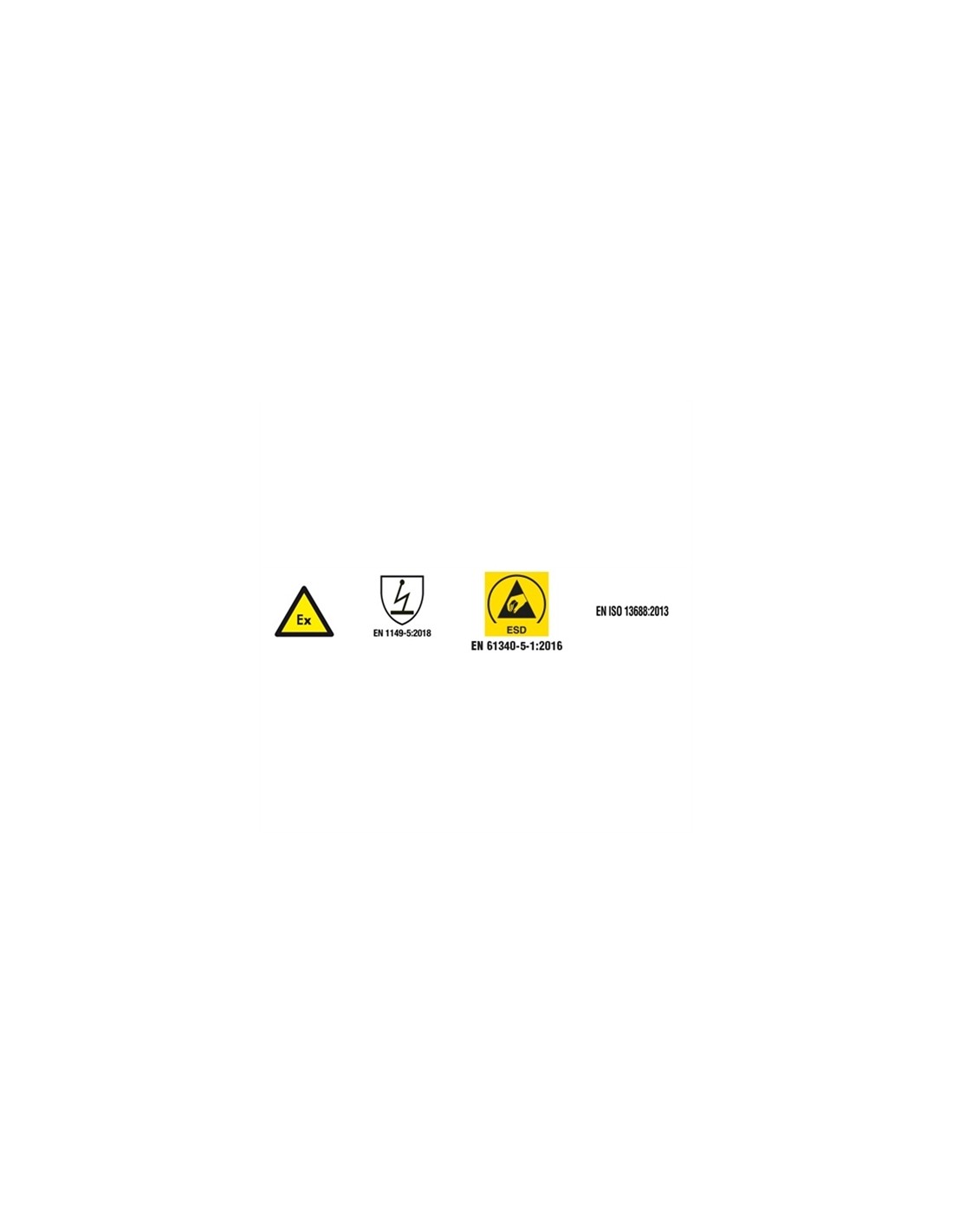 Il prodotto è certificato per le normative EN 1149-5:2018, EN 61340-5-1:2016, EN ISO 13688:2013.