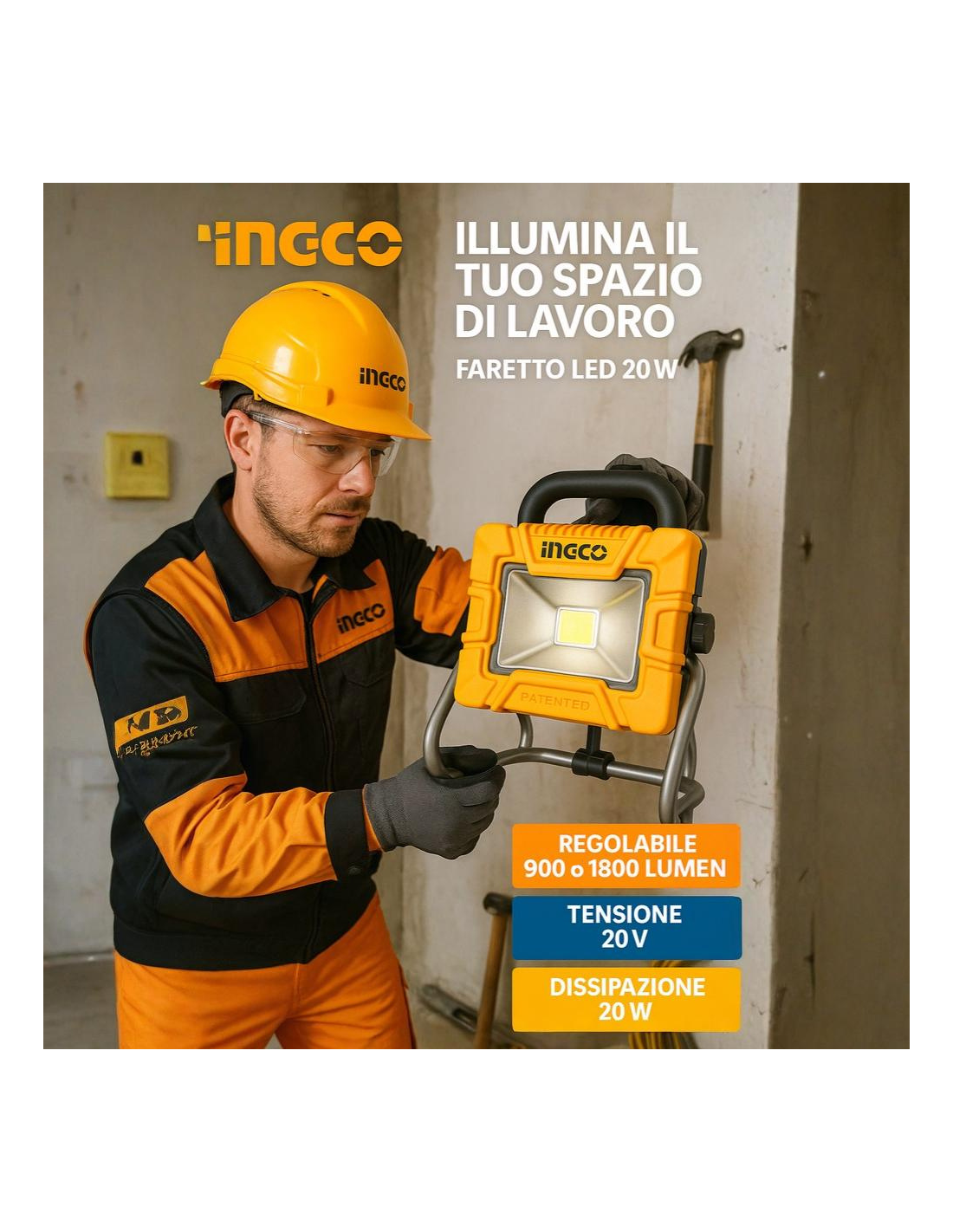 • CARATTERISTICHE: LED 20W 20V, High 1800/Low 900 lm; corpo robusto, maniglia soft-touch, gancio, piedistallo antiscivolo; peso 1,66 kg senza batteria