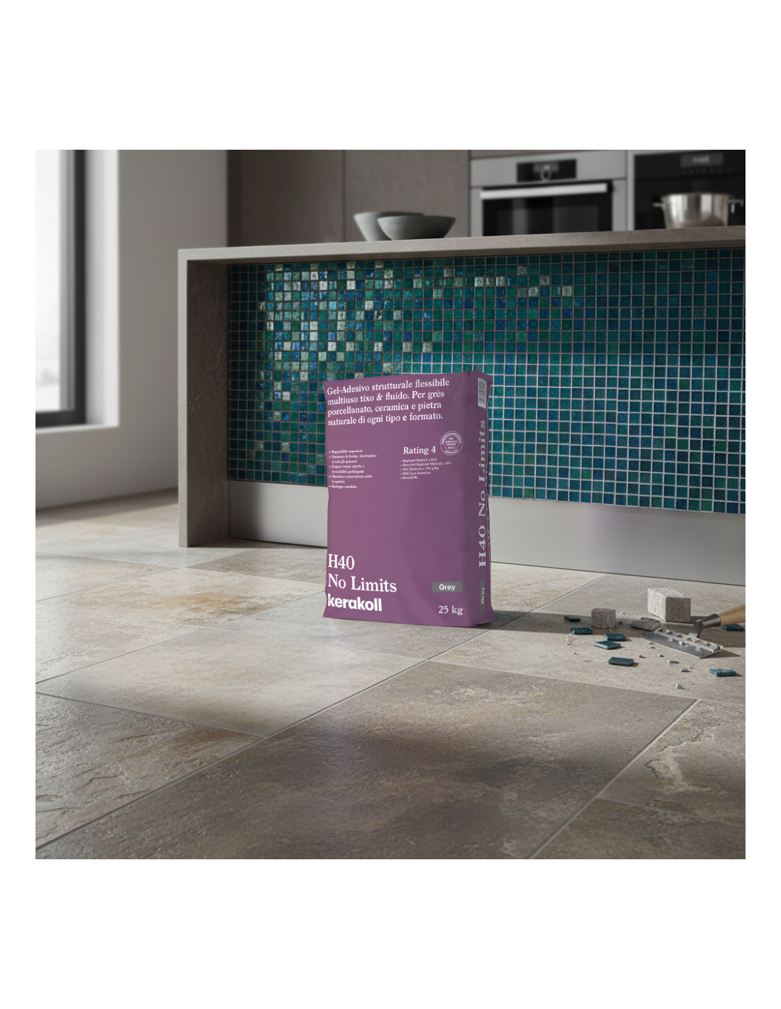 L’adesivo può essere applicato anche su supporti impermeabilizzati tramite teli polimerici aderenti o flottanti. Per materiali particolari come pietre sensibili alle macchiature si raccomanda sempre la verifica delle indicazioni tecniche del produttore prima della posa.