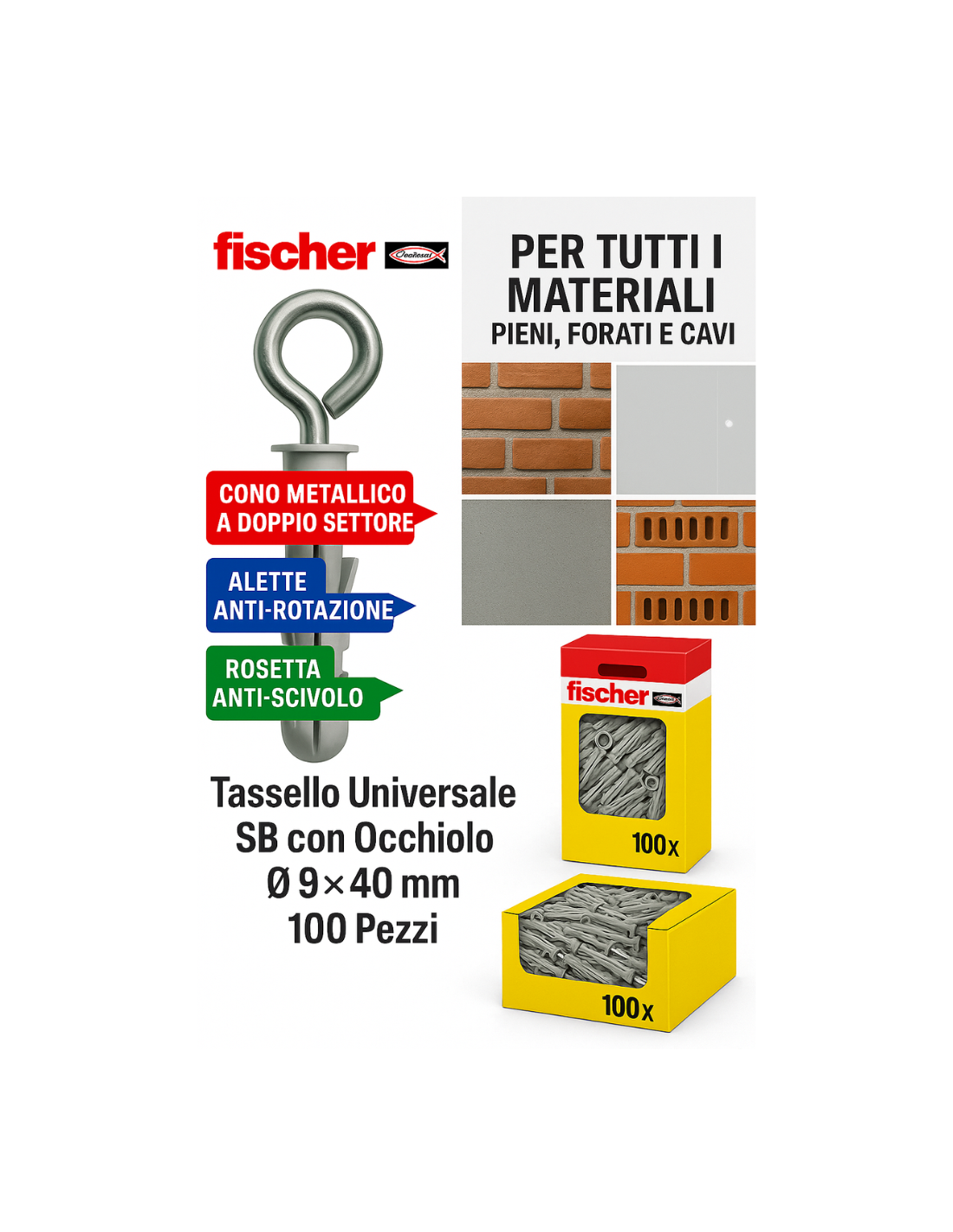 - CONFEZIONE: scatola 100 pezzi con tassello nylon SB 9/1, cono metallico e vite metrica occhiolo aperto per montaggio rapido non passante