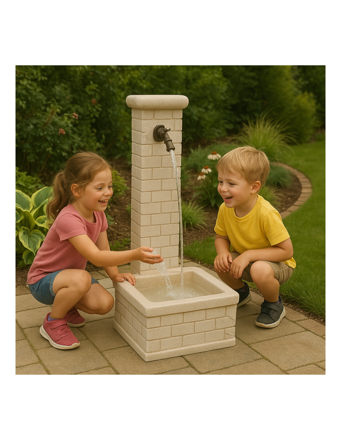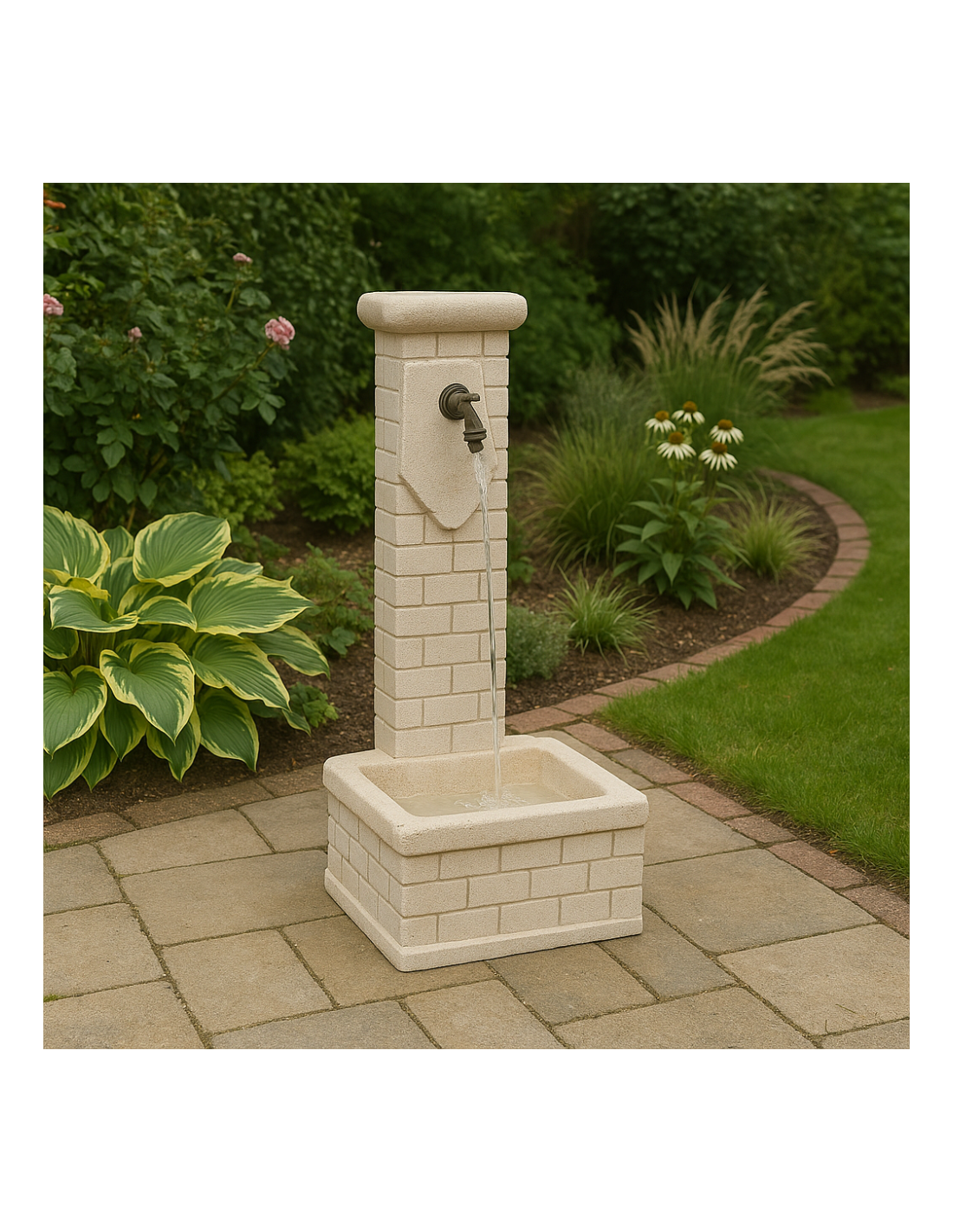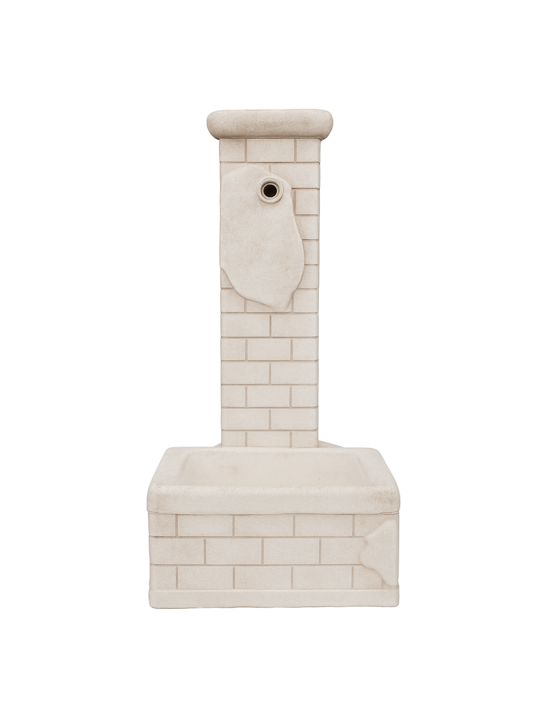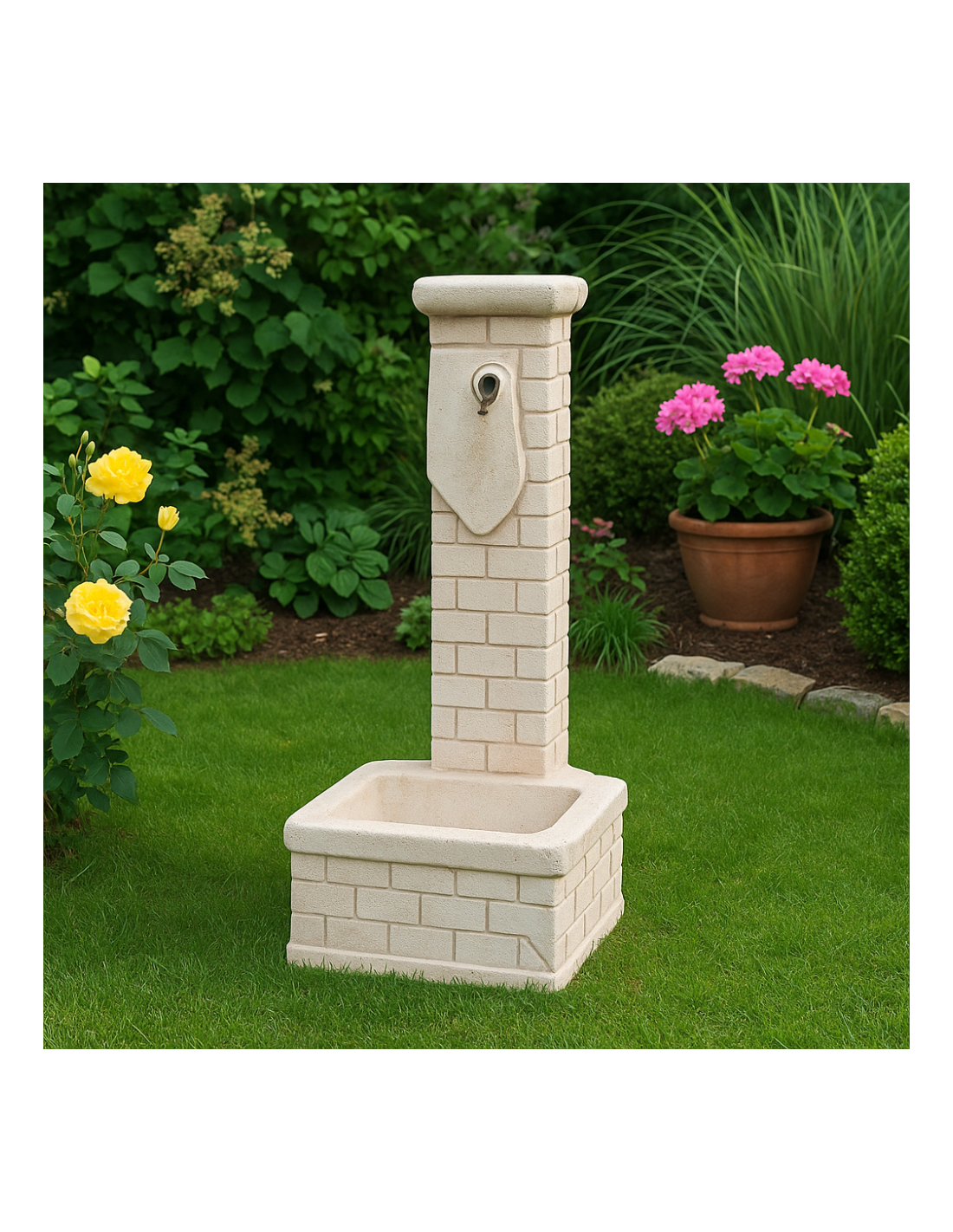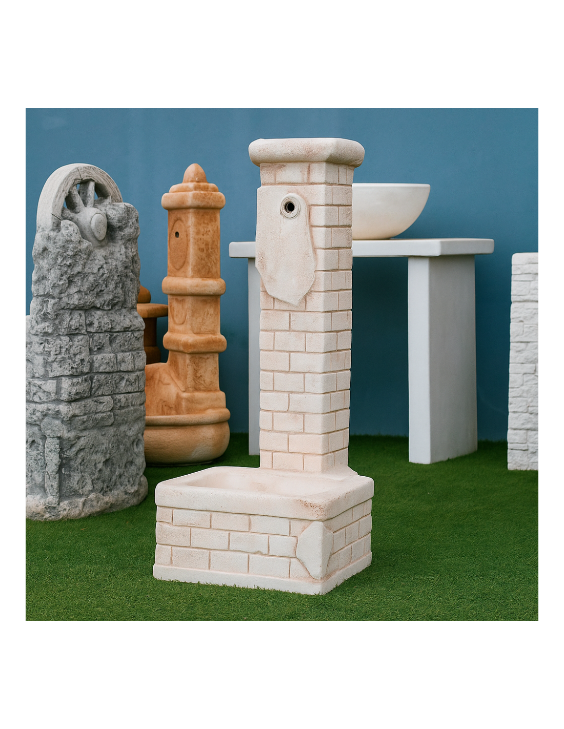Fontana da giardino in cemento effetto mattone chiaro, ideale per arredare con stile spazi esterni