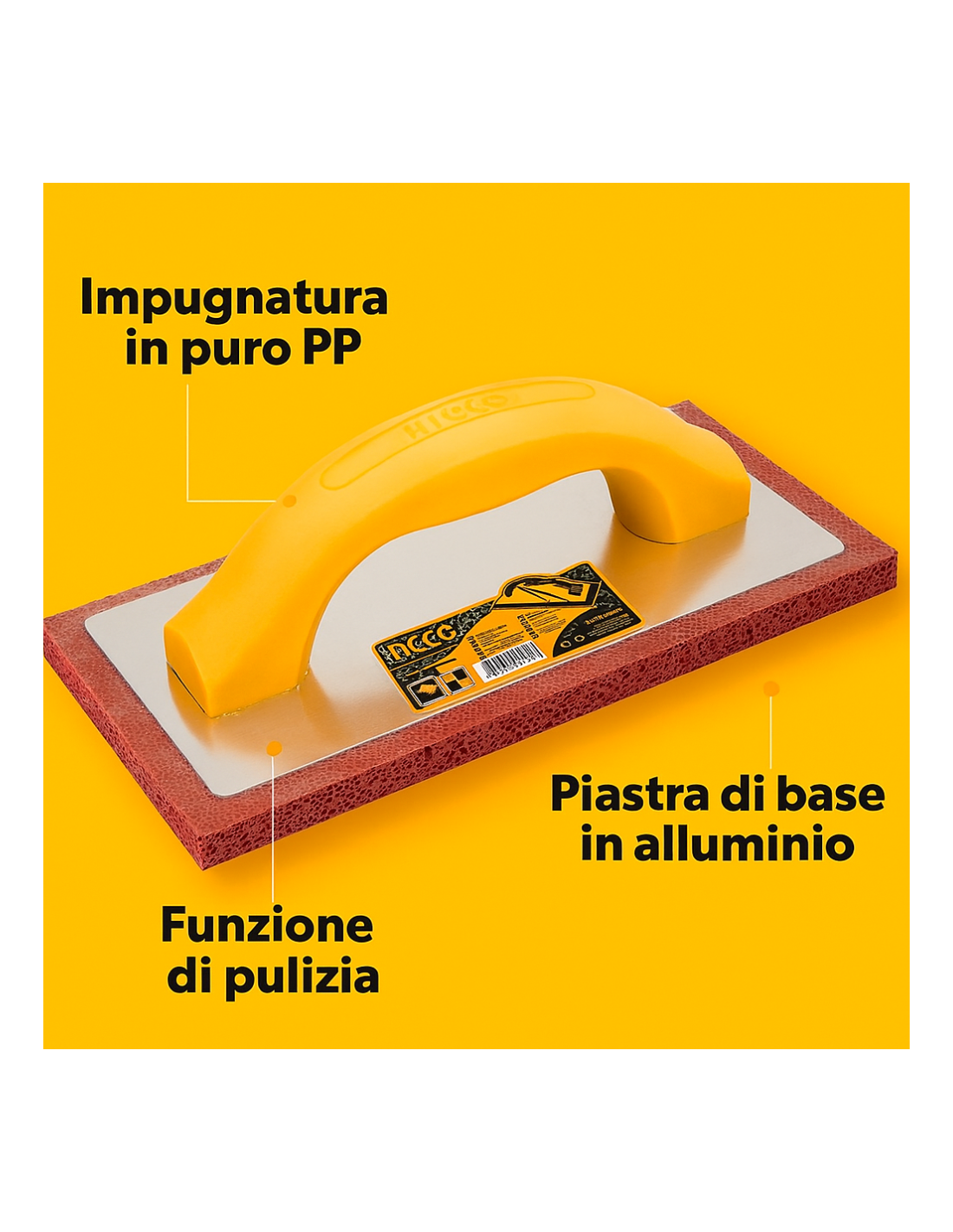 La piastra di base in alluminio aggiunge stabilità e resistenza allo strumento, assicurando una distribuzione uniforme della pressione e una maggiore durata nel tempo. Questo garantisce risultati consistenti e affidabili su una vasta gamma di superfici, dalla levigatura dei muri di cemento alla pulizia dei pavimenti.
