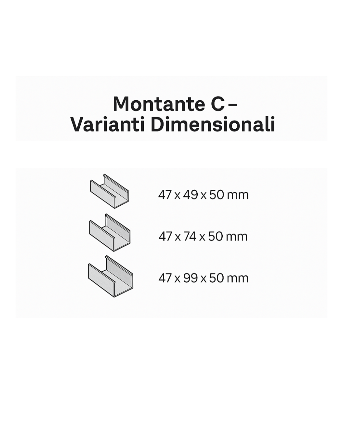 • Profilo a C con spessore 6/10 mm, studiato per garantire rigidità strutturale e facilità di montaggio
