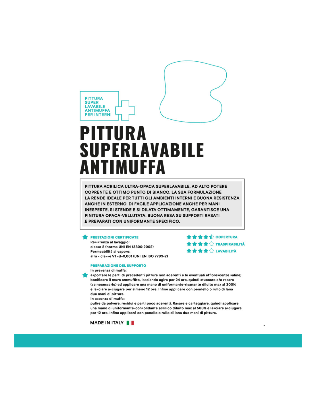 • CARATTERISTICHE: pittura acrilica all'acqua, ultra opaca, super lavabile, con ioni d'argento, ad alto potere coprente