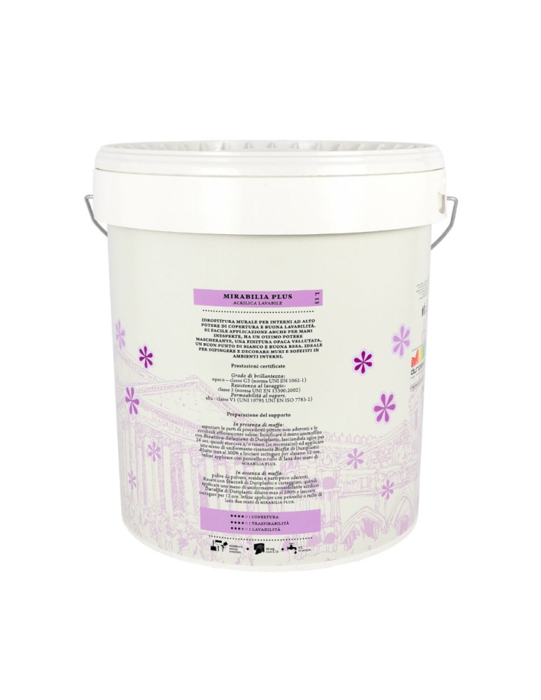 Mirabilia Plus è una idropittura acrilica lavabile di ultima generazione, concepita per offrire un equilibrio ottimale tra facilità d’uso, prestazioni tecniche e sicurezza ambientale nelle applicazioni interne. Il prodotto si basa su una formulazione avanzata a base di resine sintetiche in emulsione acrilica e pigmenti selezionati, pensata per garantire un’elevata copertura, una finitura opaca vellutata e una notevole mascheratura di imperfezioni. L’ottima permeabilità al vapore acqueo favorisce la traspirazione dei supporti murari, riducendo il rischio di muffe e condense. Mirabilia Plus rispetta rigorosamente le normative europee in materia di emissione di composti organici volatili (VOC), con valori inferiori ai limiti imposti per la tutela della salute indoor. La texture cremosa del prodotto facilita la stesura, minimizza colature e schizzi e garantisce risultati omogenei anche su superfici difficili. È progettata per essere applicata con rullo, pennello o sistemi a spruzzo su vari supporti interni adeguatamente preparati: intonaci nuovi o vecchi, cartongesso, pannelli in legno e superfici non assorbenti previa idonea preparazione.