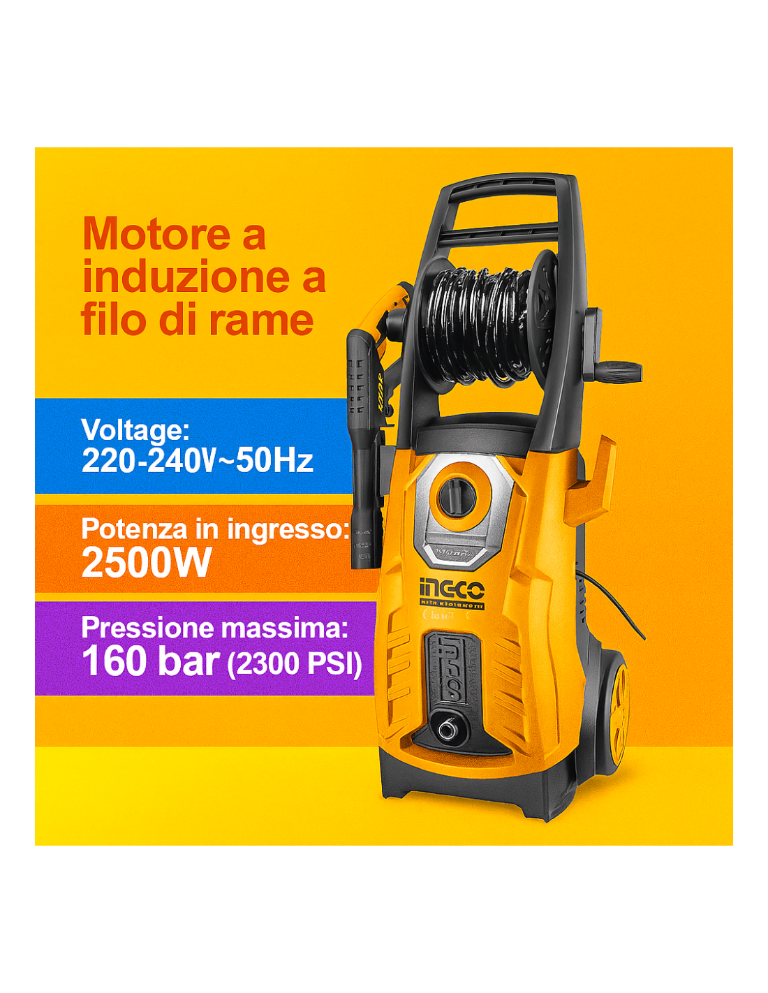 - Potenza in ingresso: 2500W / Pressione massima: 160 bar (2300 PSI)
