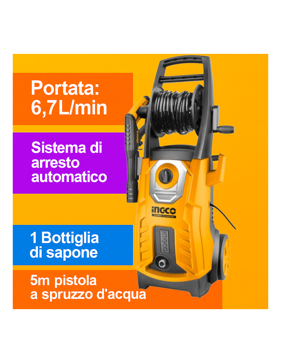 Con l'idropulitrice Ingco, non solo otterrete prestazioni elevate, ma anche una comodità senza pari grazie agli accessori inclusi. La bottiglia di sapone vi permette di aggiungere detergenti o saponi per una pulizia ancora più profonda e efficace, mentre il set pistola a spruzzo d'acqua vi offre la flessibilità di regolare la pressione e il flusso d'acqua in base alle vostre esigenze specifiche.