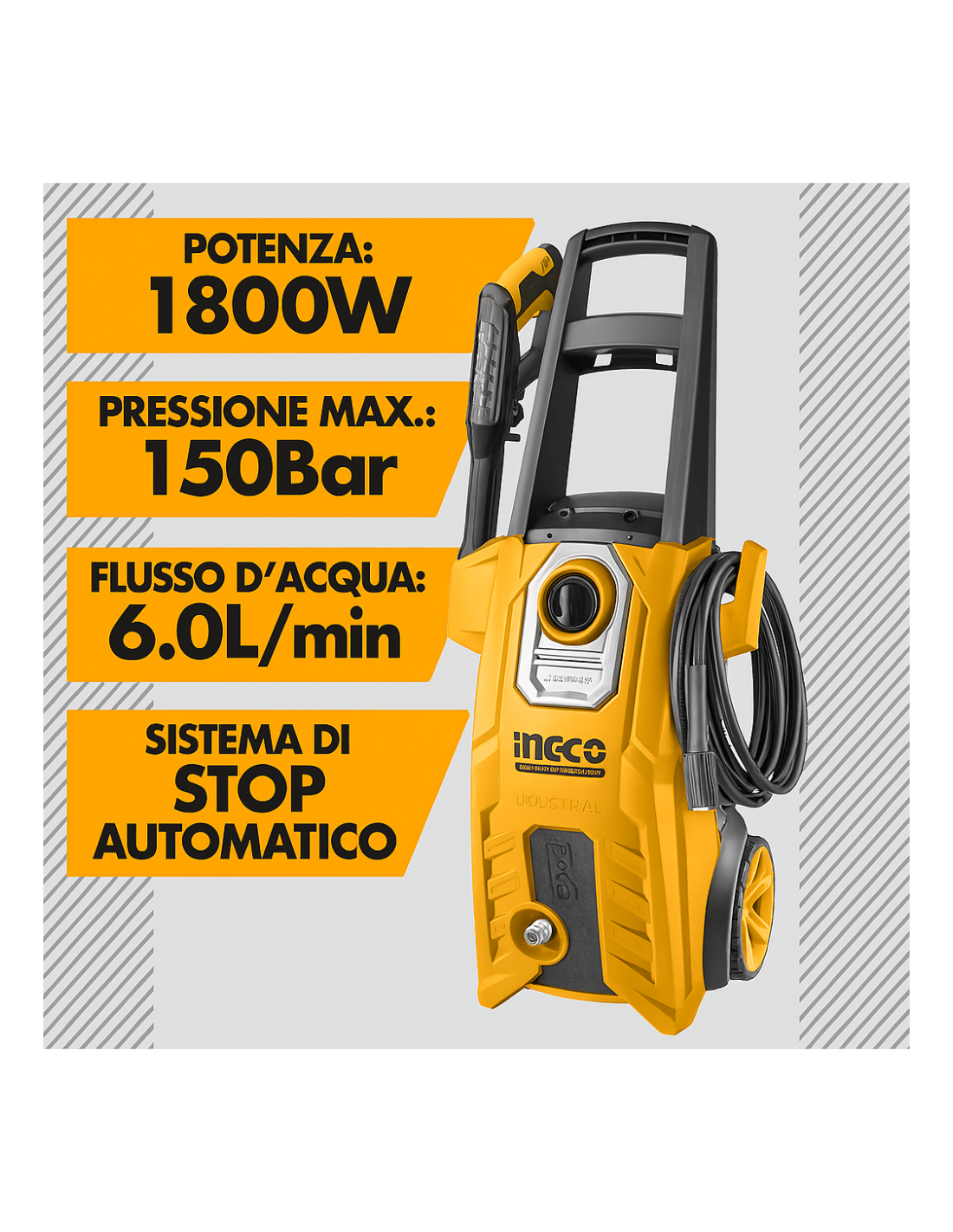L'idropulitrice da 1800W e 150BAR a marchio Ingco è il compagno perfetto per ogni lavoro di pulizia all'aperto, dal lavaggio dell'auto alla pulizia del patio e molto altro ancora.