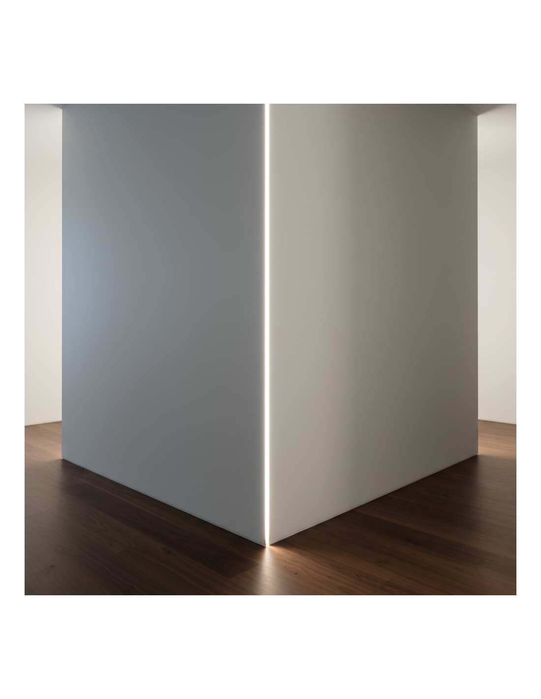 Il semilavorato filomuro in cartongesso, fibra di legno e profilo in alluminio rappresenta una soluzione d’avanguardia per l’illuminazione integrata negli ambienti moderni. Progettato per essere installato perfettamente a filo con pareti o soffitti, elimina qualsiasi sporgenza, creando una continuità visiva tra superficie architettonica e punto luce. La struttura è composta da un pannello stratificato di cartongesso (9,5 mm) e fibra MDF (3,5 mm), per uno spessore complessivo di 13 mm che assicura robustezza e stabilità. Il cuore tecnico del sistema è il profilo dissipatore in alluminio, che garantisce la corretta dissipazione del calore generato dalle strip LED alloggiate al suo interno, mantenendo così efficienza e durata delle sorgenti luminose nel tempo.