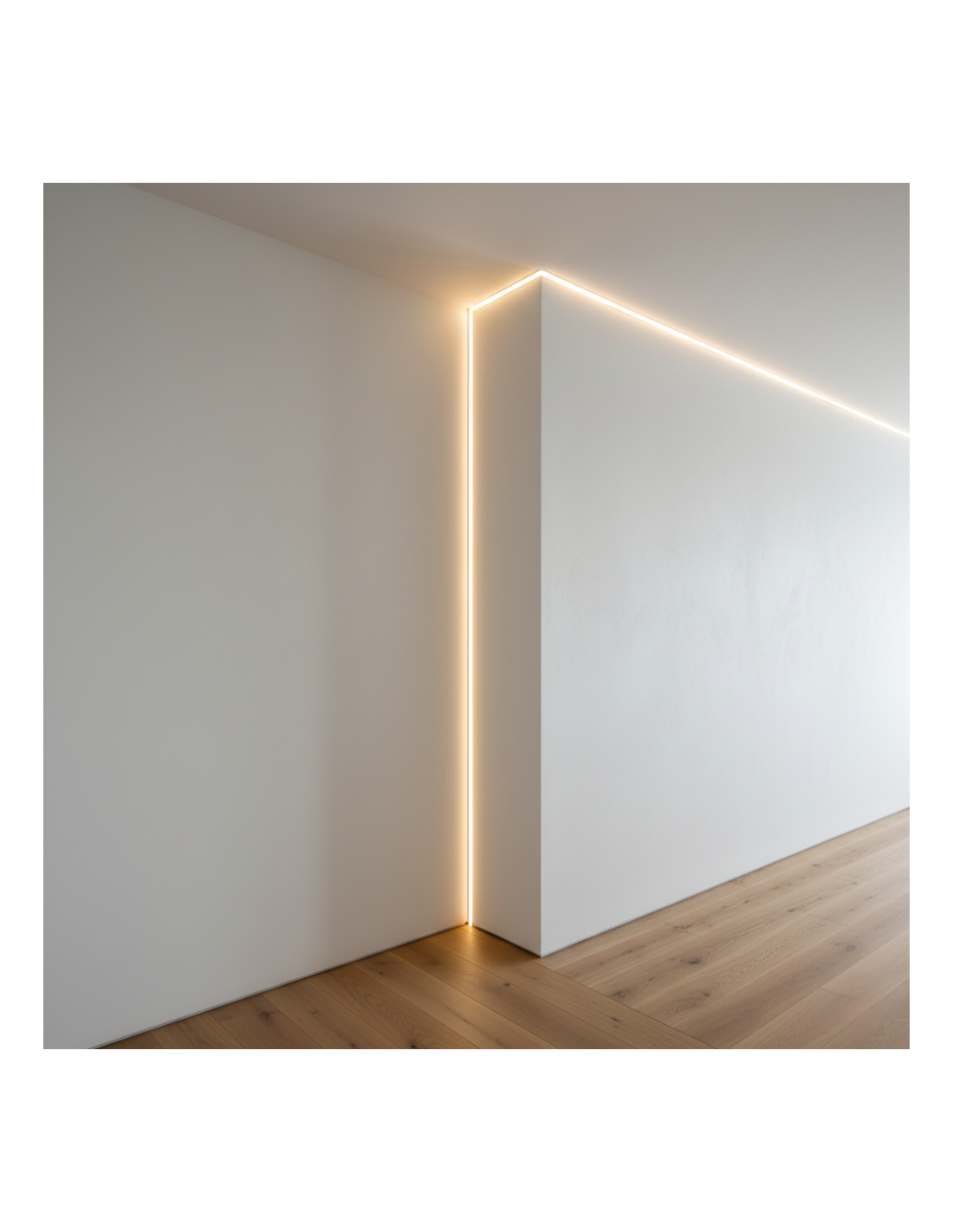 - Elevata precisione nella posa: il profilo dissipatore in alluminio è già dimensionato per ospitare le strip LED, eliminando errori o necessità di adattamenti successivi.