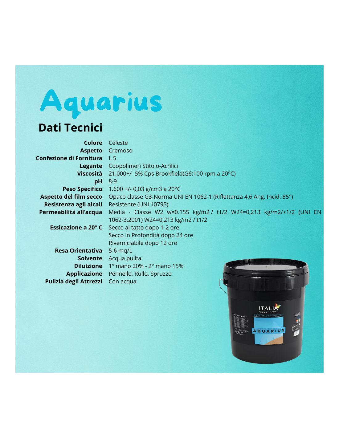 300% e lasciare asciugare per 12 ore. Infine applicare con pennello, rullo e/o spruzzo due mani di Italia Colorpaint Aquarius Pittura Acrilica per Piscine in Cemento diluito con acqua al 20% (prima mano) al 15% la seconda. - Superfici cementizie già verniciate: asportare le parti di precedenti pitture non aderenti e le eventuali efflorescenze saline- Stuccare eventuali crepe, irregolarità e/o imperfezioni del supporto e carteggiare- bonificare le parti ammuffite con Bioattiva soluzione lasciandola agire per almeno 24 ore, quindi applicare una mano di uniformante-consolidante acrilico Duralfix diluito max al 300% e lasciare asciugare per almeno 12 ore. Infine applicare con pennello, rullo di lana e/o spruzzo due mani di Italia Colorpaint Aquarius Pittura Acrilica per Piscine in Cemento diluito con acqua al 20% (Prima mano) 15% la seconda.
