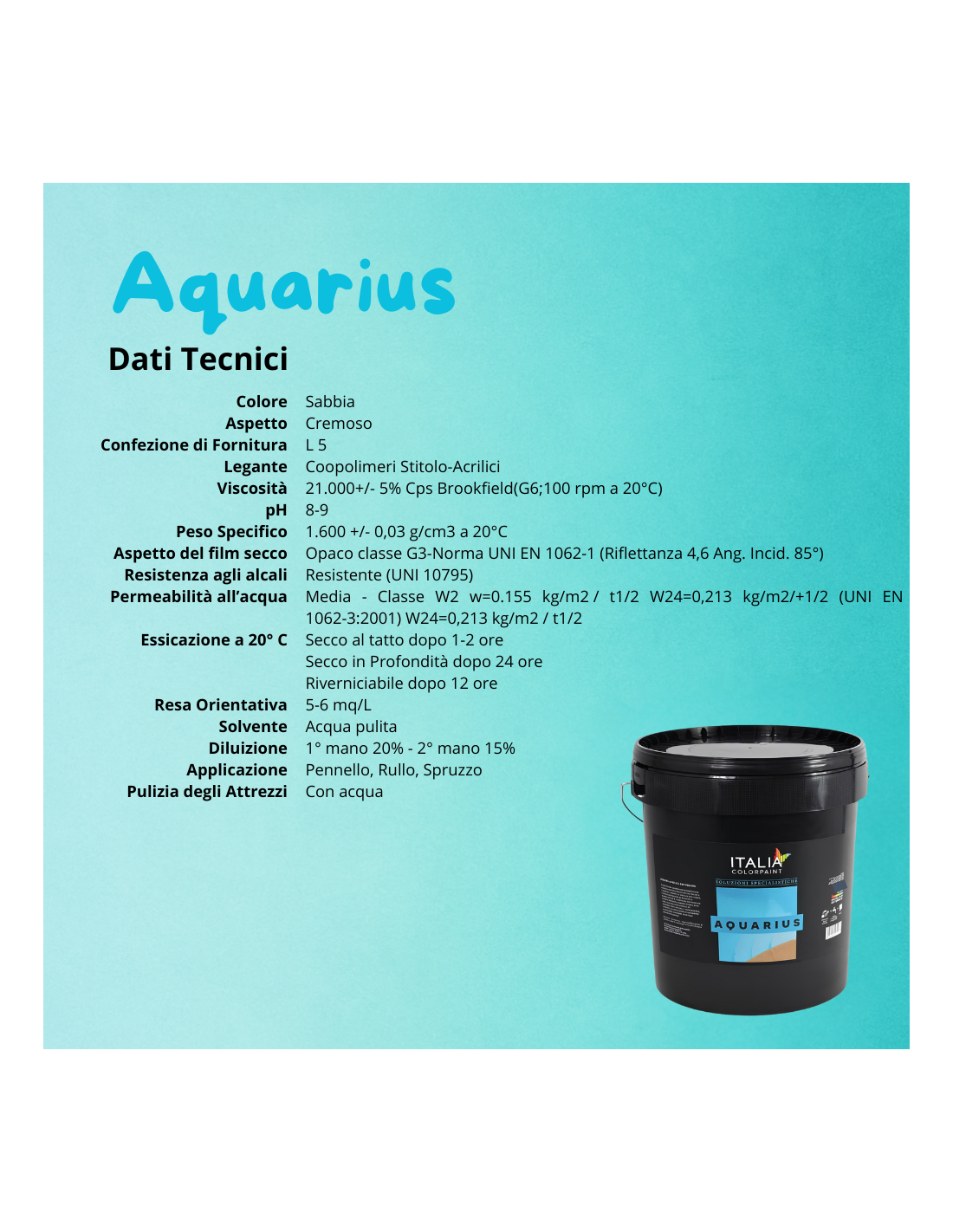 300% e lasciare asciugare per 12 ore. Infine applicare con pennello, rullo e/o spruzzo due mani di  Italia Colorpaint Aquarius Pittura Acrilica per Piscine in Cemento diluito con acqua al 20% (prima mano) al 15% la seconda.