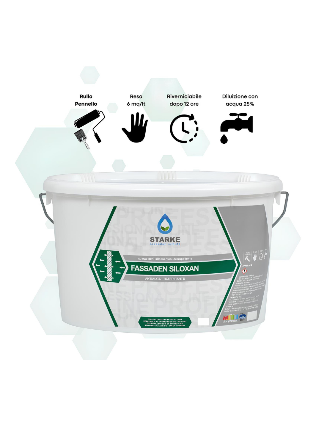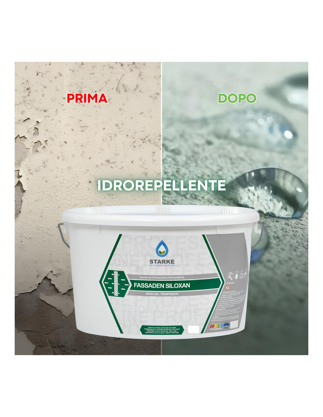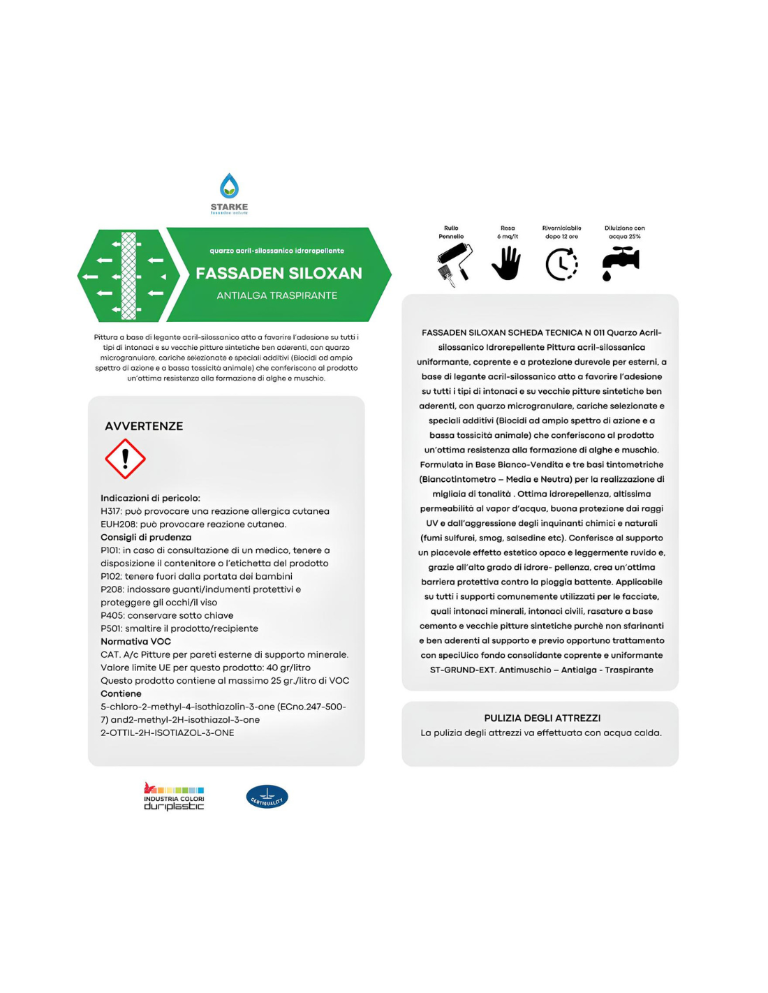 Verniciatura su intonaci nuovi o già verniciati di facciate esterne per conferire buona idrorepellenza, alto grado di traspirazione e resistenza all’attecchimento di alghe, mediante applicazione di una pittura a base di legante acril-silossanico in dispersione acquosa, speciali additivi antialga e quarzo microgranulare (FASSADEN SILOXAN di STARKE )