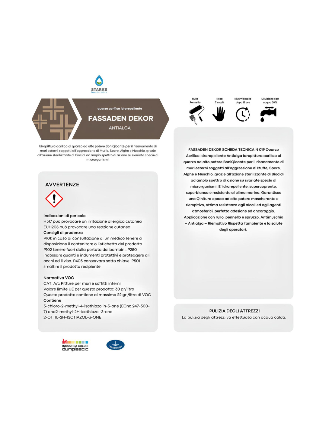 • Classificazione V.O.C.: CAT. A/a Pitture per pareti esterne di supporto minerale Valore limite U.E.= 40gr/lt. FASSADEN DEKOR contiene max 29gr/lt di V.O.C.