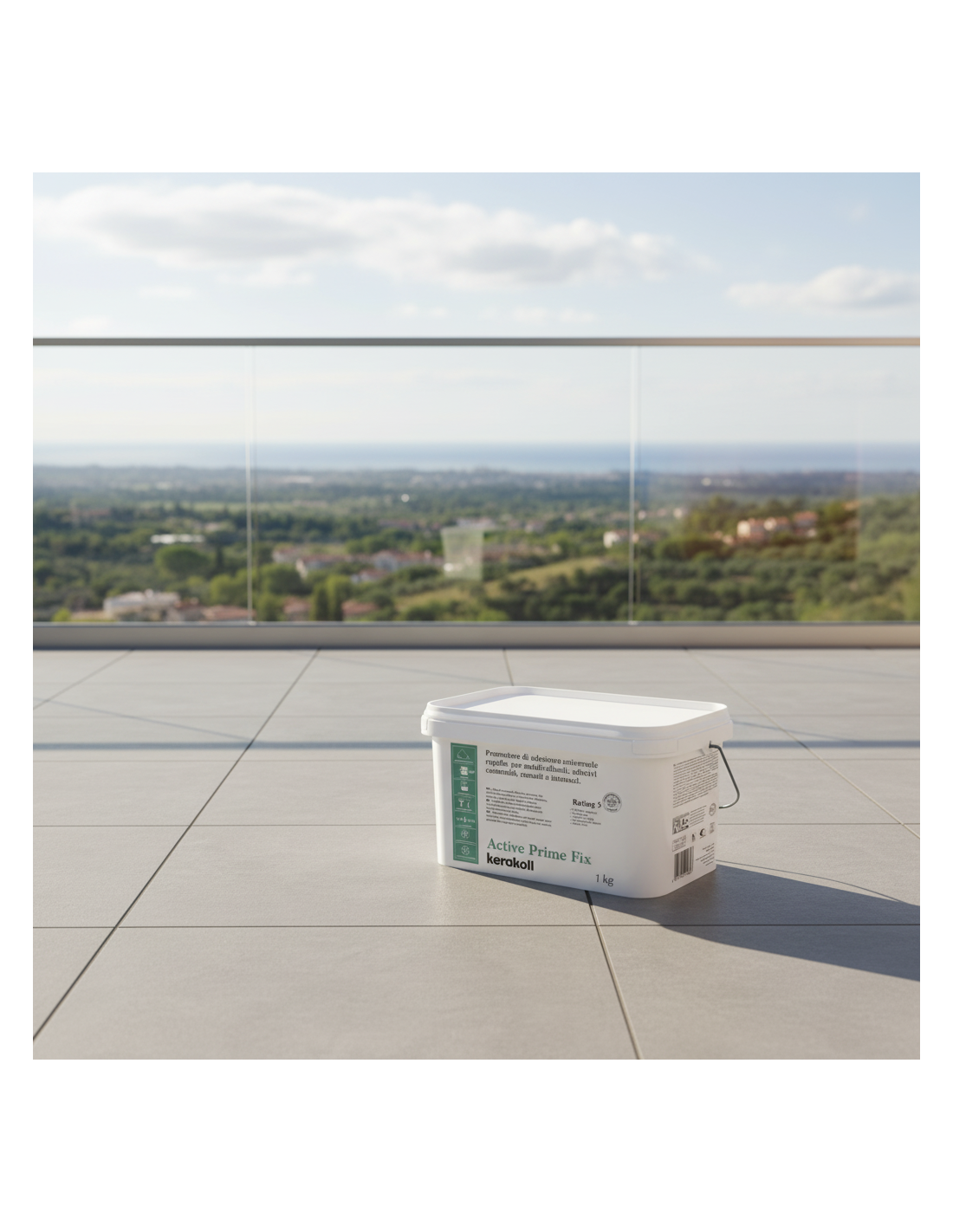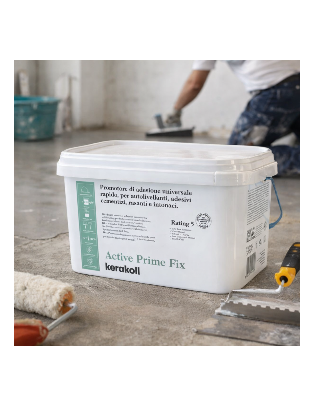 - Versatilità applicativa: Active Prime Fix si adatta a numerosi tipi di supporto, inclusi pavimenti in ceramica, marmette, pietra naturale, calcestruzzo, massetti cementizi o in anidrite, parquet, pannelli in cartongesso o laterogesso, superfici metalliche rigide e fondi con residui di colla o vernice.