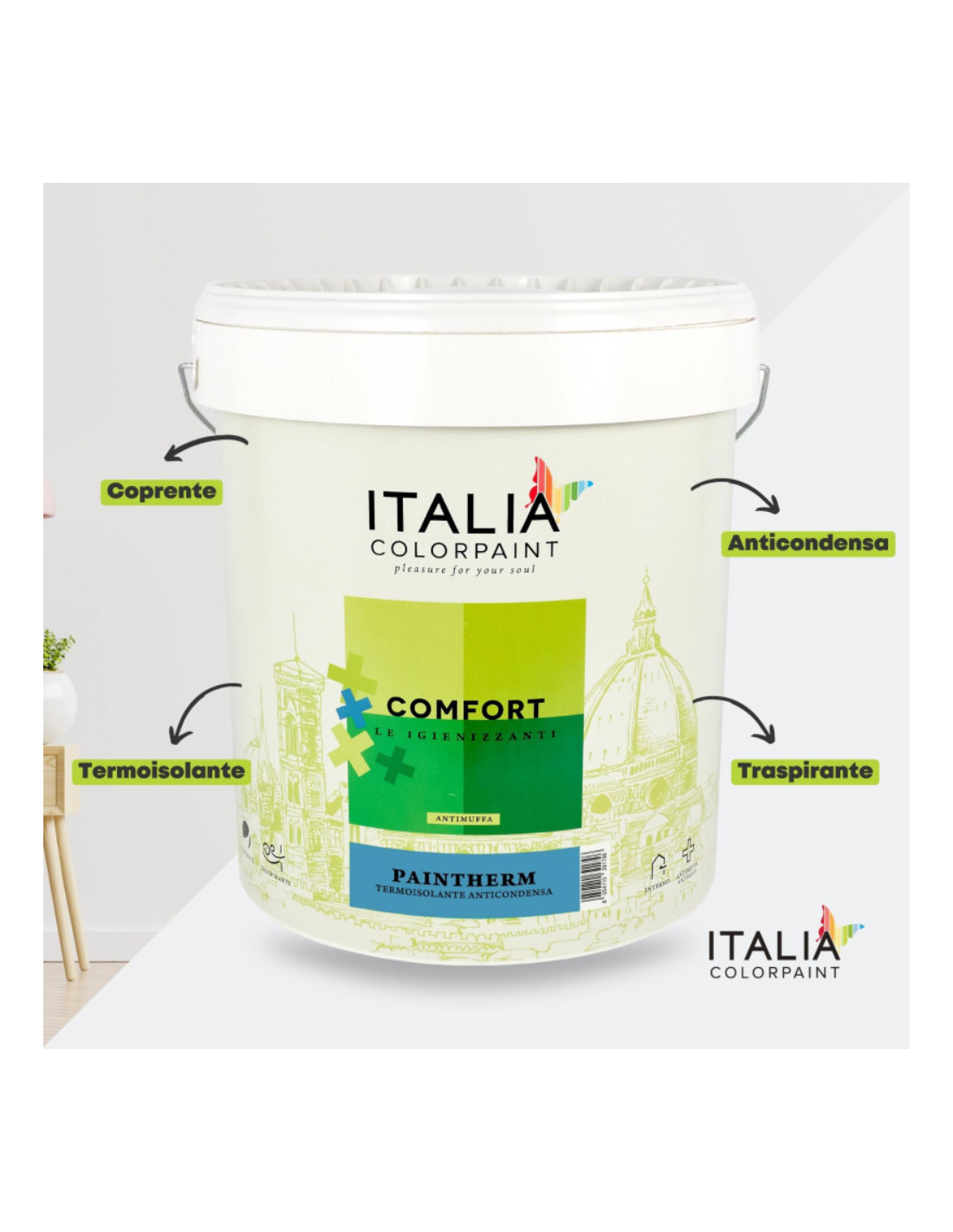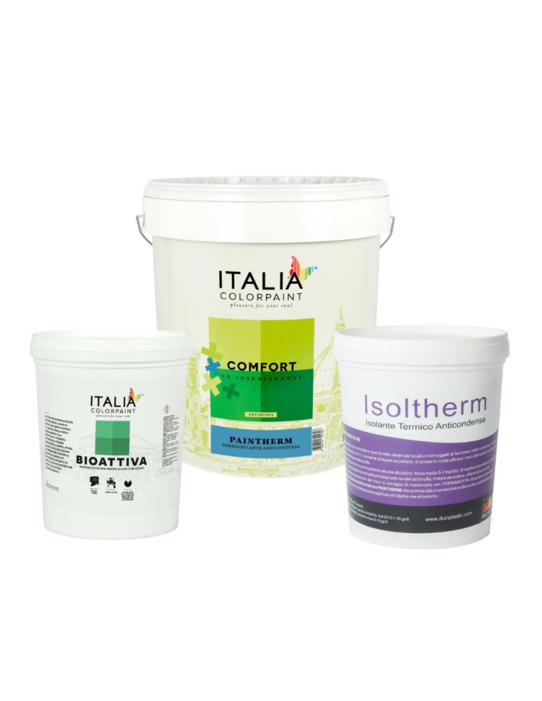 - FUNZIONALITÀ: isoltherm prepara la superficie, riducendo i ponti termici. Bioattiva elimina muffe e batteri, prevenendone la riformazione. Paintherm crea una barriera isolante riducendo la dispersione di calore