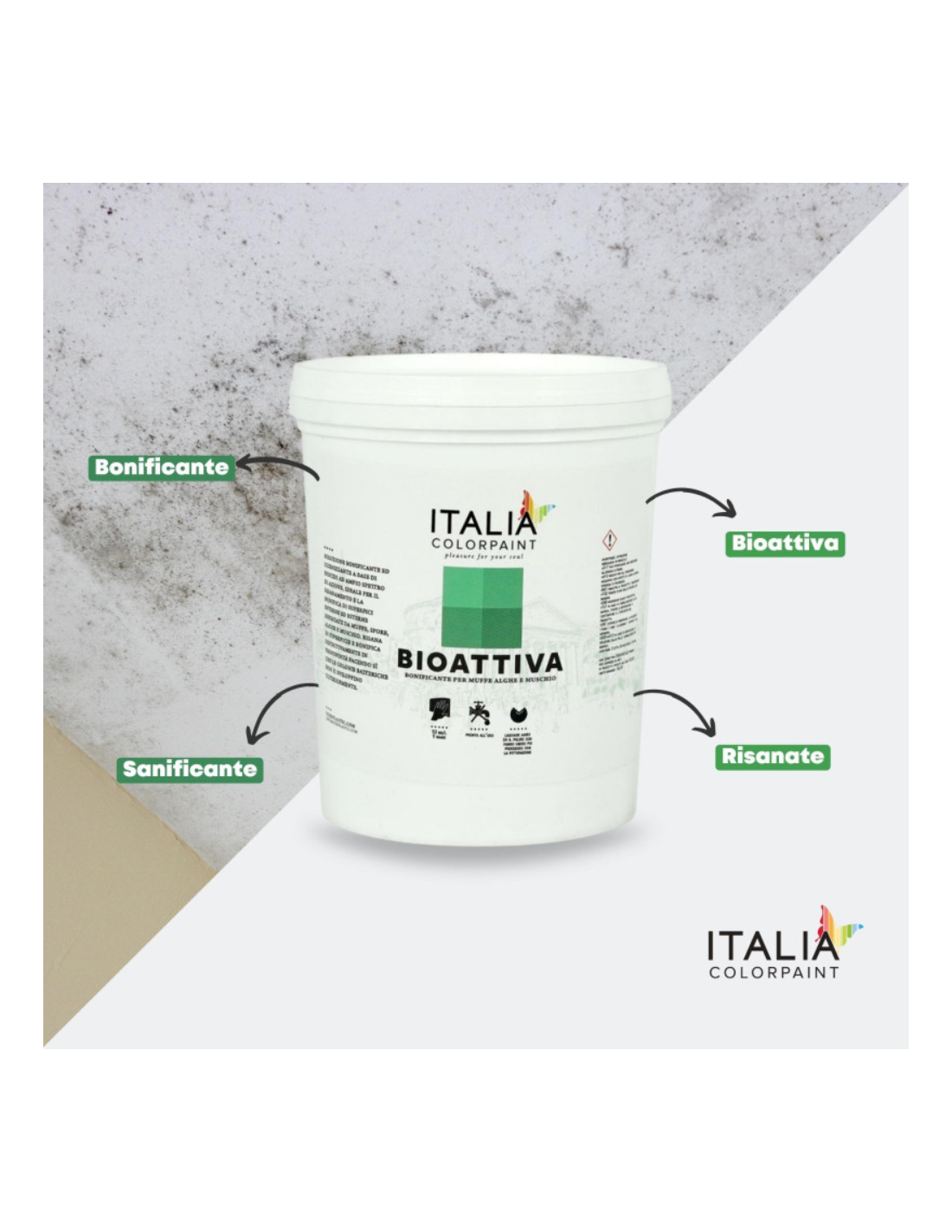 - Bioattiva: Un potente agente bonificante che elimina efficacemente muffe, alghe e batteri dalle superfici, prevenendone la riformazione e garantendo un ambiente sano e igienico.
