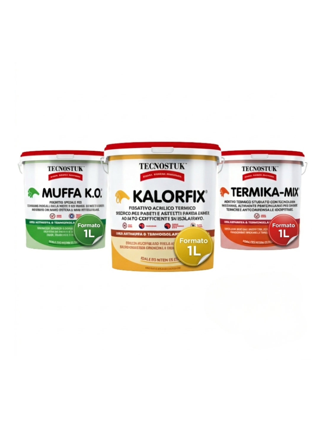 Composizione del KIT: Muffa K.O 1 Lt + Kalorfix 1 Lt + Termika-Mix 1 Lt