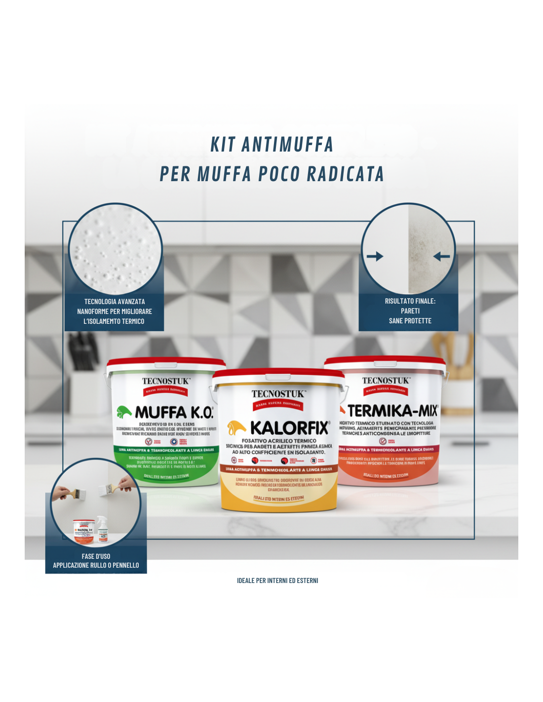 Kit antimuffa completo per superfici protette: soluzione integrata con Muffa K.O., Kalorfix e Termika-Mix