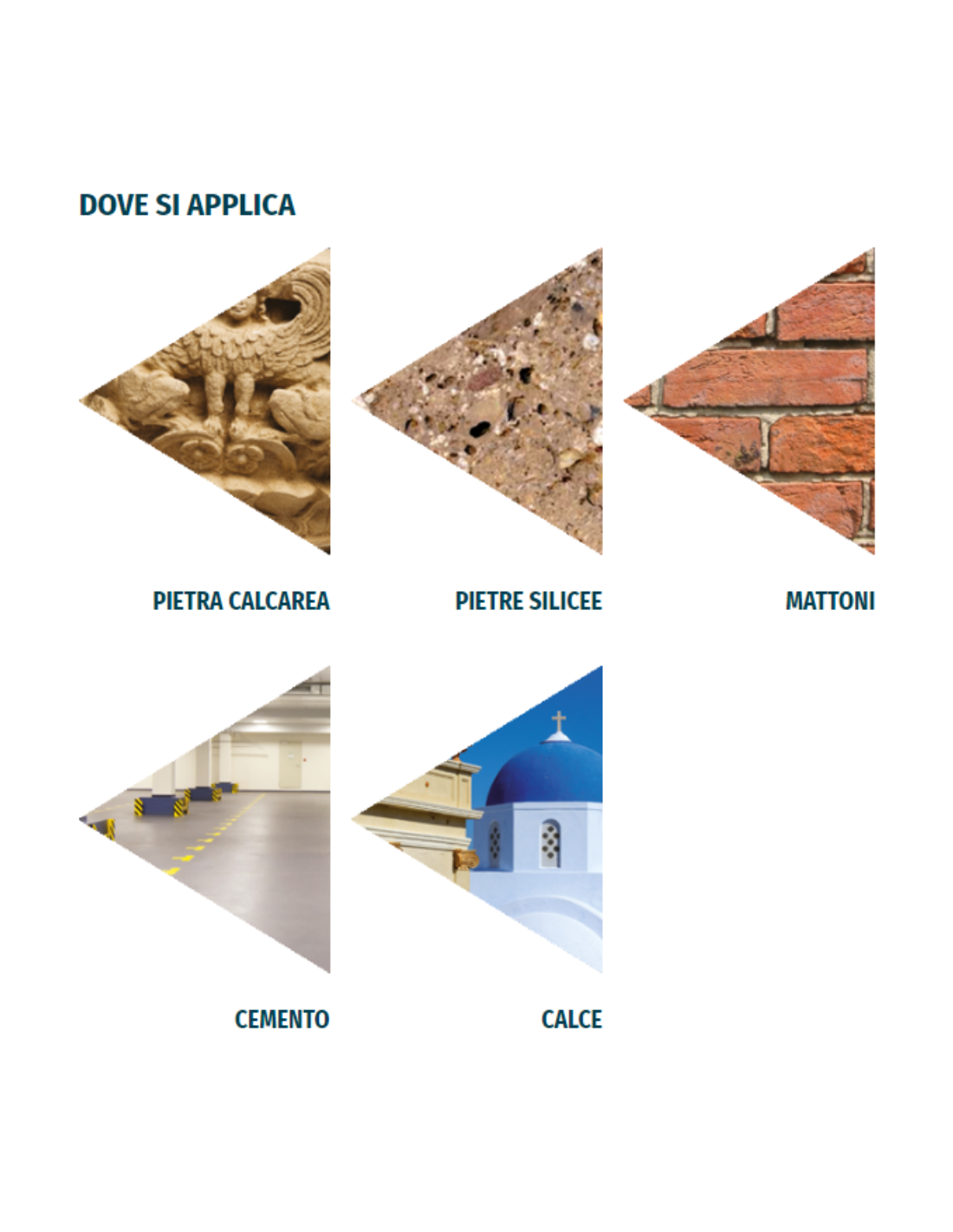 - Grazie alle sue proprietà idrorepellenti, impedisce all'acqua e ai sali/inquinanti disciolti di penetrare nei materiali, proteggendo le superfici dal degrado e prolungando la loro durata nel tempo.