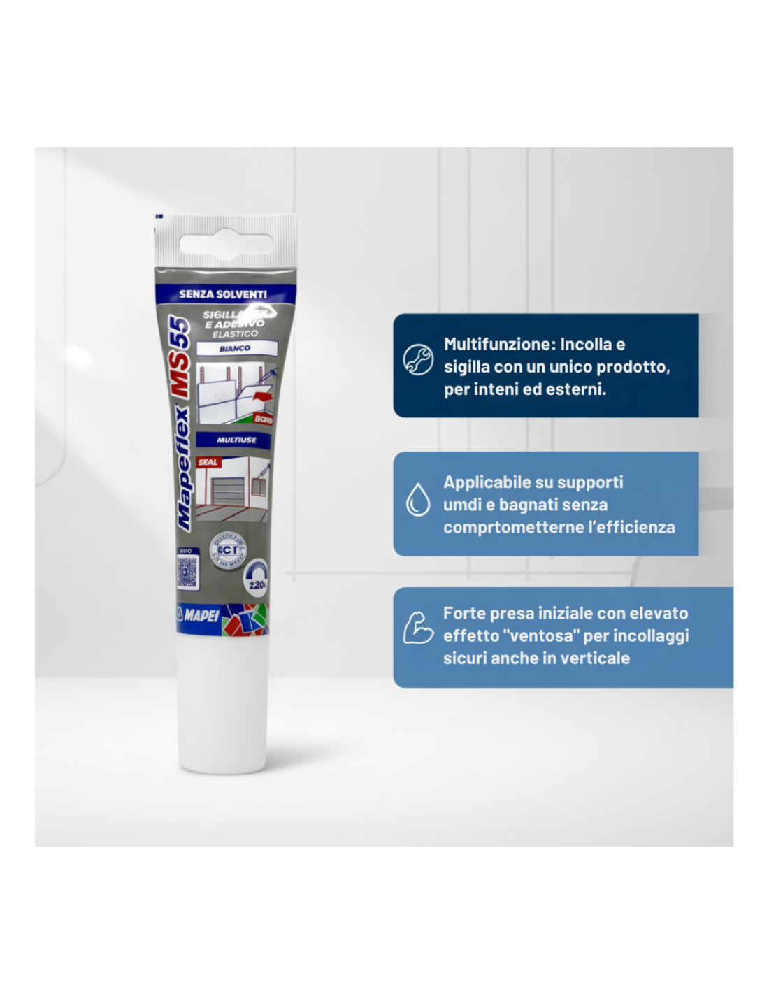 - Può essere utilizzato su superfici bagnate? Sì, Mapeflex MS 55 aderisce anche su fondi umidi o bagnati purché siano solidi e puliti. Tuttavia l’applicazione su superfici permanentemente immerse richiede la valutazione del primer più idoneo.