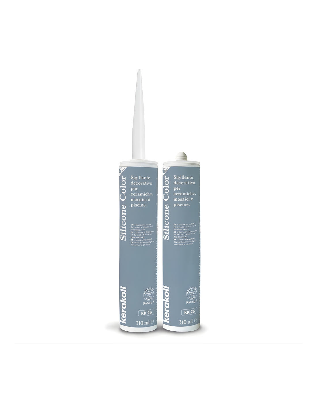 - Dove può essere utilizzato? Silicone Color KK 26 è adatto per sigillature tra piastrelle ceramiche in bagni, cucine, piscine pubbliche/private, mosaici vetrosi/ceramici ed elementi sanitari sia interni sia esterni. Funziona anche su infissi metallici o in vetroresina.