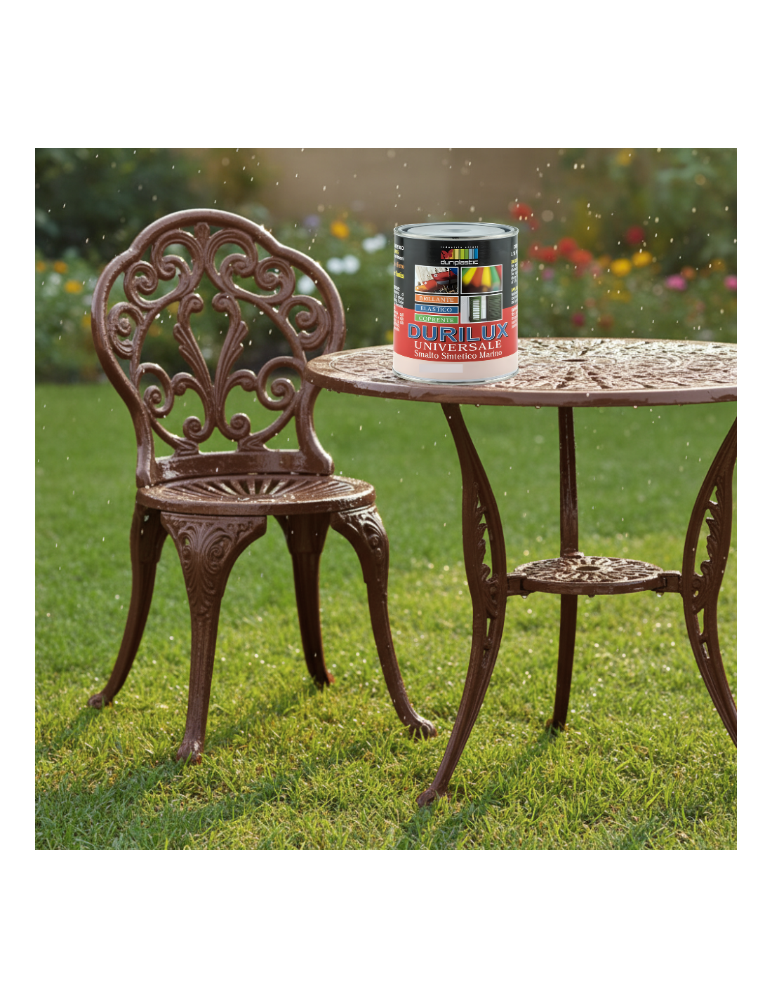 La texture cremosa del prodotto permette una stesura agevole, priva di colature e accumuli, facilitando l’applicazione sia a pennello che a rullo o spruzzo. La versatilità del Durilux consente di adattare la diluizione (10-15%) in funzione del metodo scelto per l’applicazione. L’essiccazione è rapida: dopo 2-3 ore la superficie risulta asciutta al tatto, mentre la completa polimerizzazione avviene entro 24 ore. Per ottenere una protezione ottimale e una resa estetica uniforme, si raccomanda l’applicazione di due mani di prodotto con intervallo minimo di 12 ore tra una mano e l’altra. Il ciclo di preparazione del supporto è fondamentale: per il ferro occorre rimuovere ruggine o vecchie vernici sfogliate e applicare un fondo antiruggine; per il legno è indispensabile carteggiare accuratamente ed eventualmente utilizzare un primer adatto.