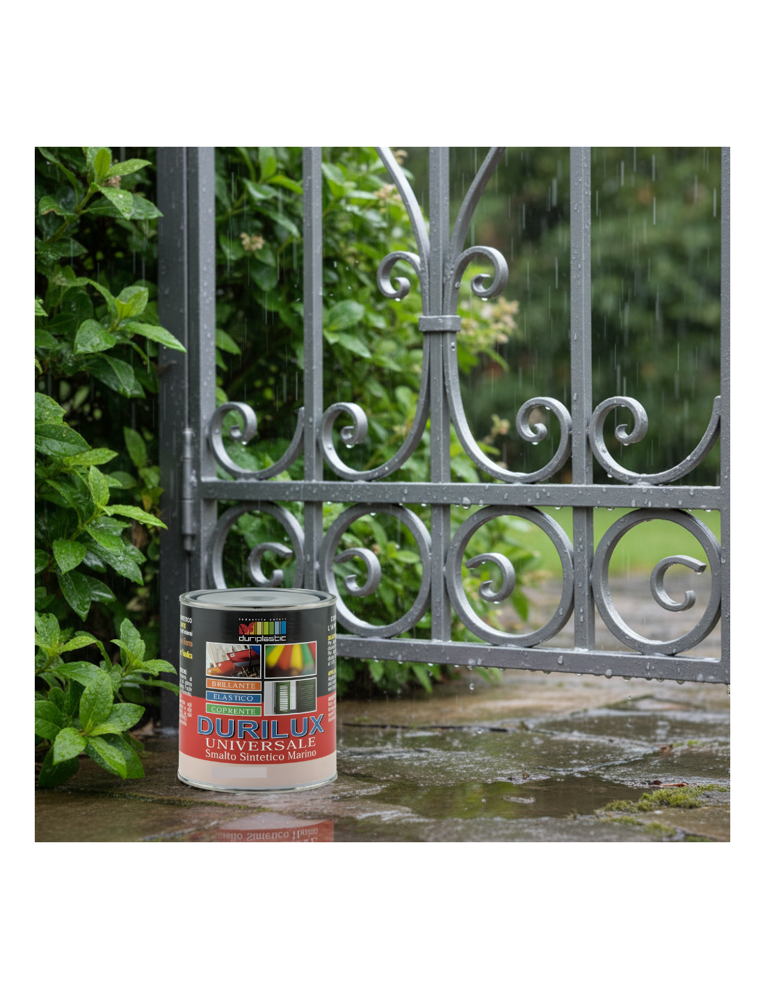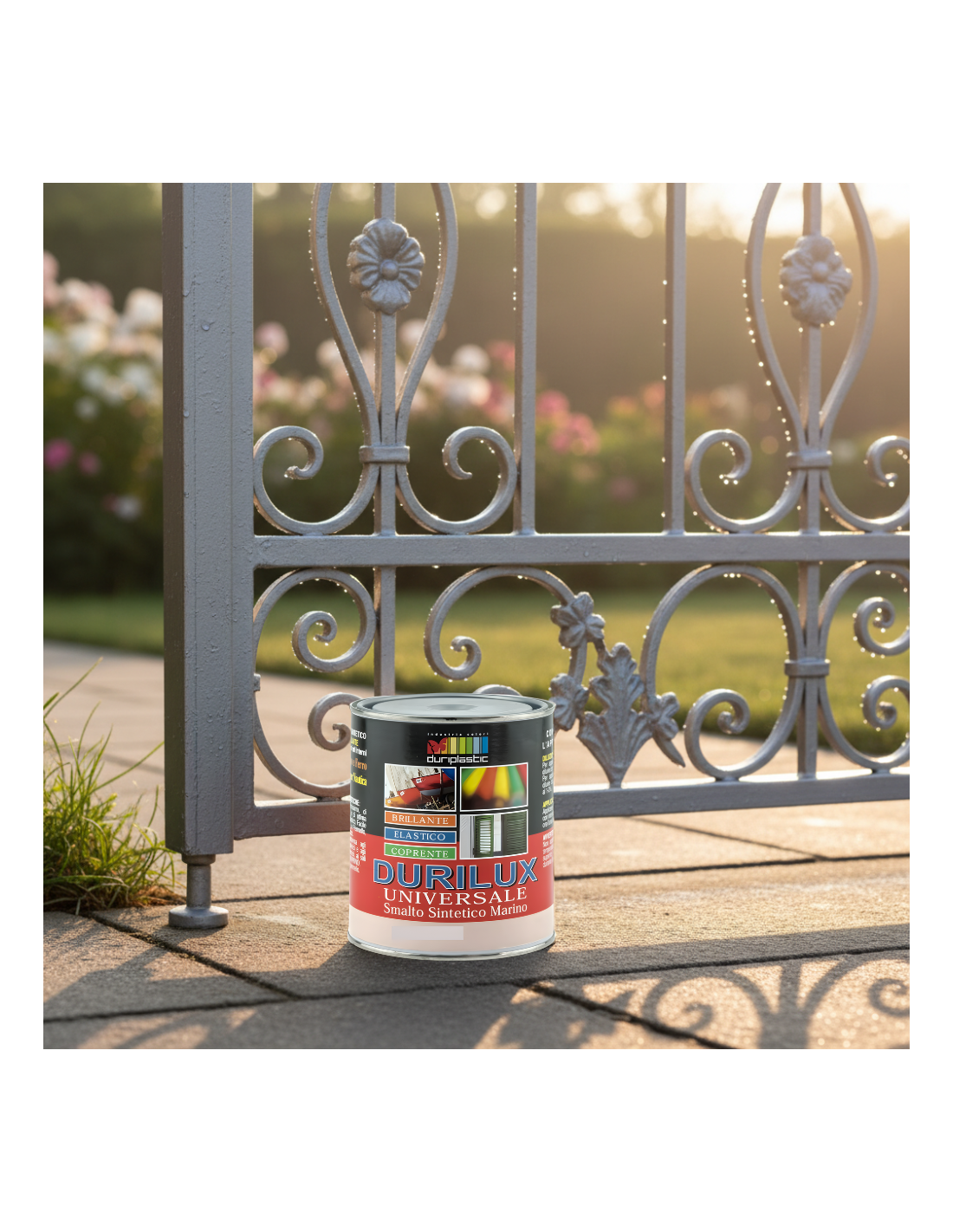 La texture cremosa del prodotto permette una stesura agevole, priva di colature e accumuli, facilitando l’applicazione sia a pennello che a rullo o spruzzo. La versatilità del Durilux consente di adattare la diluizione (10-15%) in funzione del metodo scelto per l’applicazione. L’essiccazione è rapida: dopo 2-3 ore la superficie risulta asciutta al tatto, mentre la completa polimerizzazione avviene entro 24 ore. Per ottenere una protezione ottimale e una resa estetica uniforme, si raccomanda l’applicazione di due mani di prodotto con intervallo minimo di 12 ore tra una mano e l’altra. Il ciclo di preparazione del supporto è fondamentale: per il ferro occorre rimuovere ruggine o vecchie vernici sfogliate e applicare un fondo antiruggine; per il legno è indispensabile carteggiare accuratamente ed eventualmente utilizzare un primer adatto.