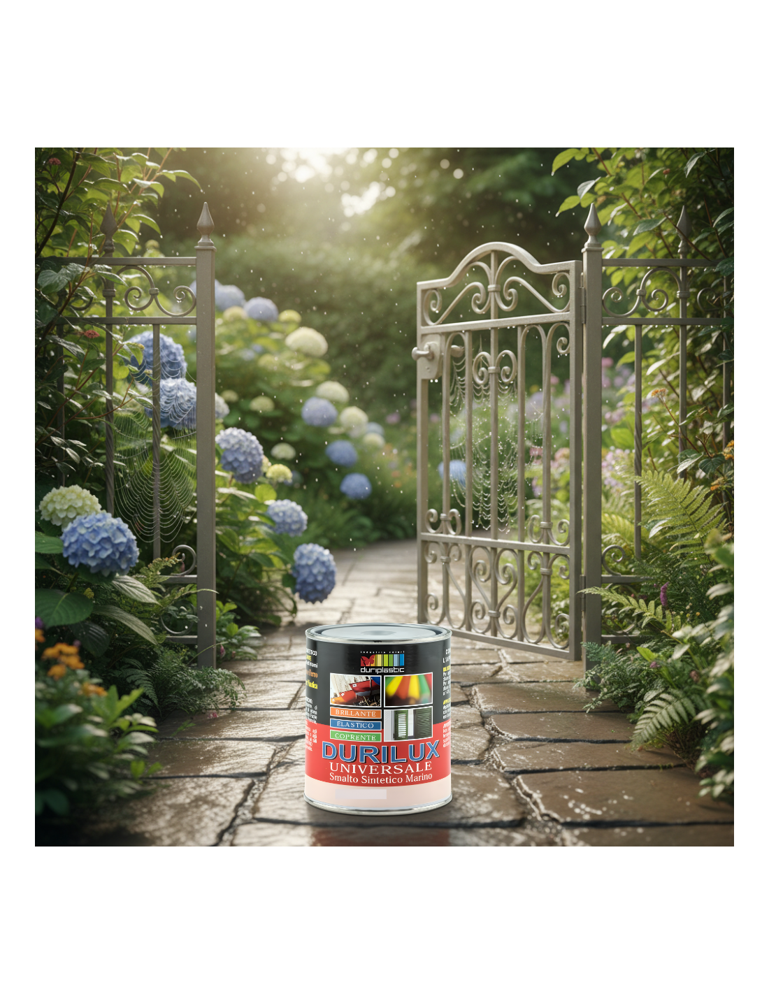 La texture cremosa del prodotto permette una stesura agevole, priva di colature e accumuli, facilitando l’applicazione sia a pennello che a rullo o spruzzo. La versatilità del Durilux consente di adattare la diluizione (10-15%) in funzione del metodo scelto per l’applicazione. L’essiccazione è rapida: dopo 2-3 ore la superficie risulta asciutta al tatto, mentre la completa polimerizzazione avviene entro 24 ore. Per ottenere una protezione ottimale e una resa estetica uniforme, si raccomanda l’applicazione di due mani di prodotto con intervallo minimo di 12 ore tra una mano e l’altra. Il ciclo di preparazione del supporto è fondamentale: per il ferro occorre rimuovere ruggine o vecchie vernici sfogliate e applicare un fondo antiruggine; per il legno è indispensabile carteggiare accuratamente ed eventualmente utilizzare un primer adatto.