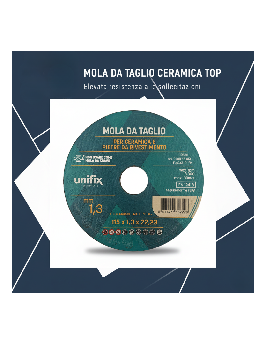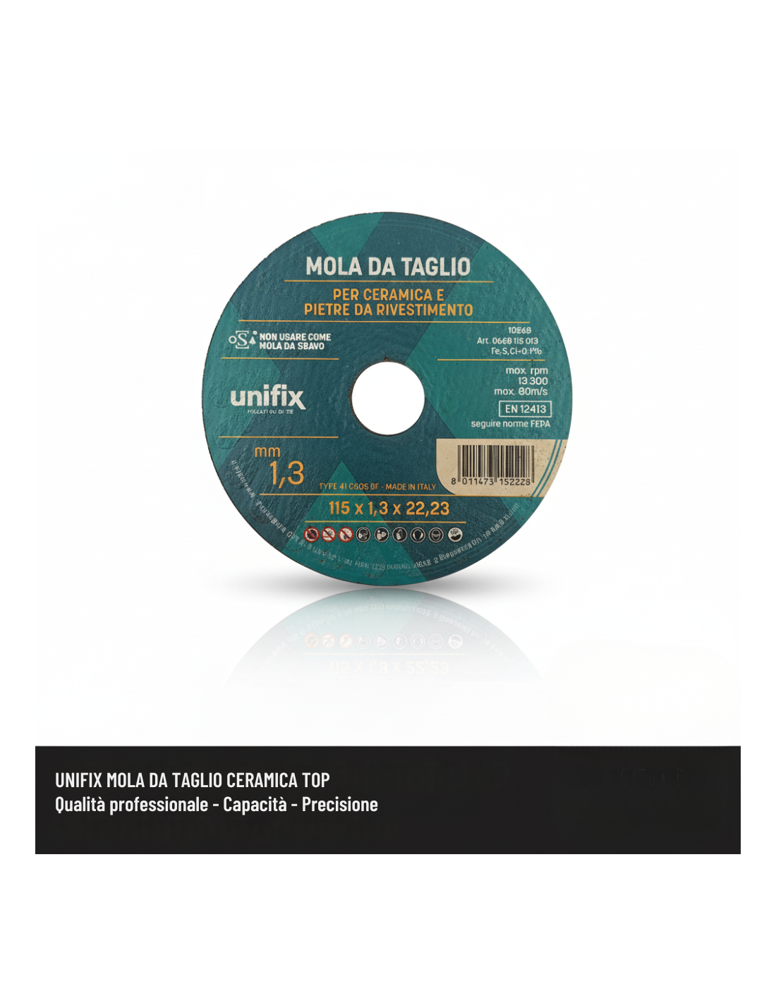 La mola da taglio ceramica top Ø 115 x 1,3 x 22 mm rappresenta una soluzione avanzata e affidabile per il taglio preciso di piastrelle, ceramiche e pietre da rivestimento. La progettazione della mola si basa su un attento bilanciamento tra materiali di alta qualità e tecnologie costruttive innovative. Il corpo disco è realizzato con una miscela ottimizzata di carburo di silicio, resina sintetica polimerizzata e fibre di vetro, elementi che cooperano per offrire robustezza strutturale, resistenza all’usura e sicurezza operativa. La combinazione di questi materiali consente al disco di sostenere sollecitazioni meccaniche anche durante impieghi gravosi e prolungati.