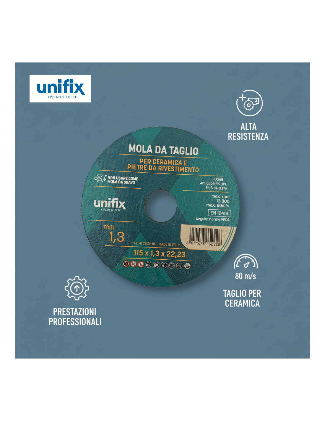Con una velocità periferica massima supportata fino a 80 m/s e un numero massimo di giri di 13.300 rpm, il disco assicura performance elevate anche su materiali particolarmente duri come gres porcellanato o pietre naturali compatibili. L’attacco con alesaggio da 22,23 mm rende la mola universalmente compatibile con le smerigliatrici angolari più diffuse tra i professionisti del settore edilizio.
