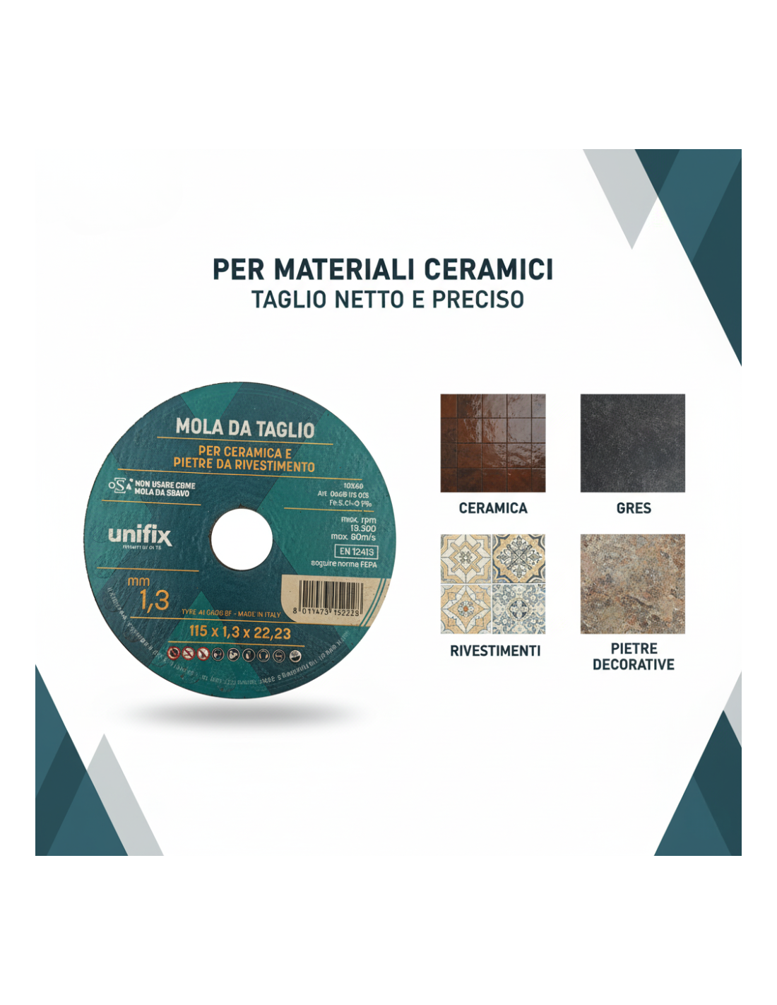 - Taglio rapido e preciso: Il ridotto spessore della mola permette di eseguire tagli netti e precisi su ceramiche e pietre senza sforzi eccessivi, riducendo al minimo le scheggiature dei bordi.