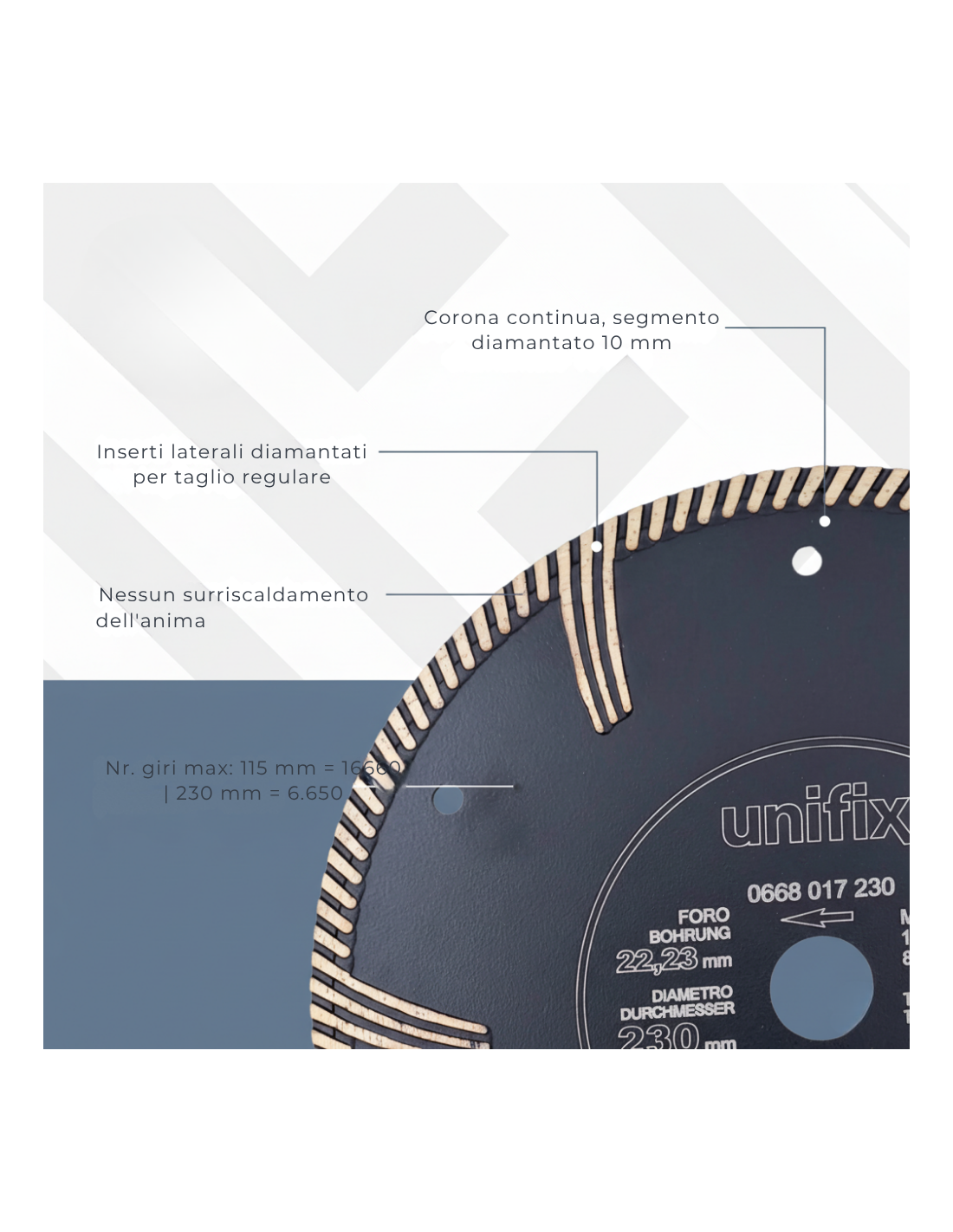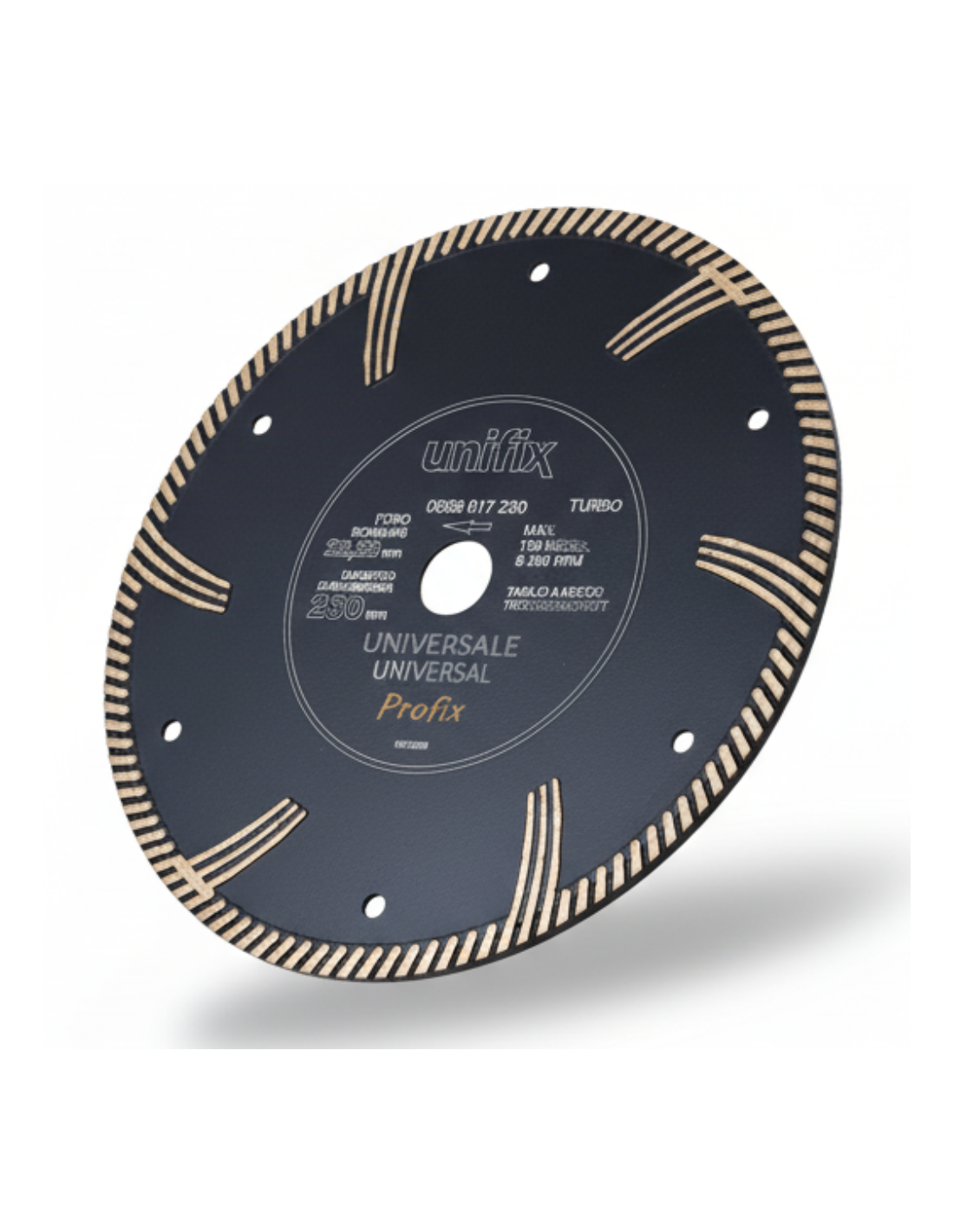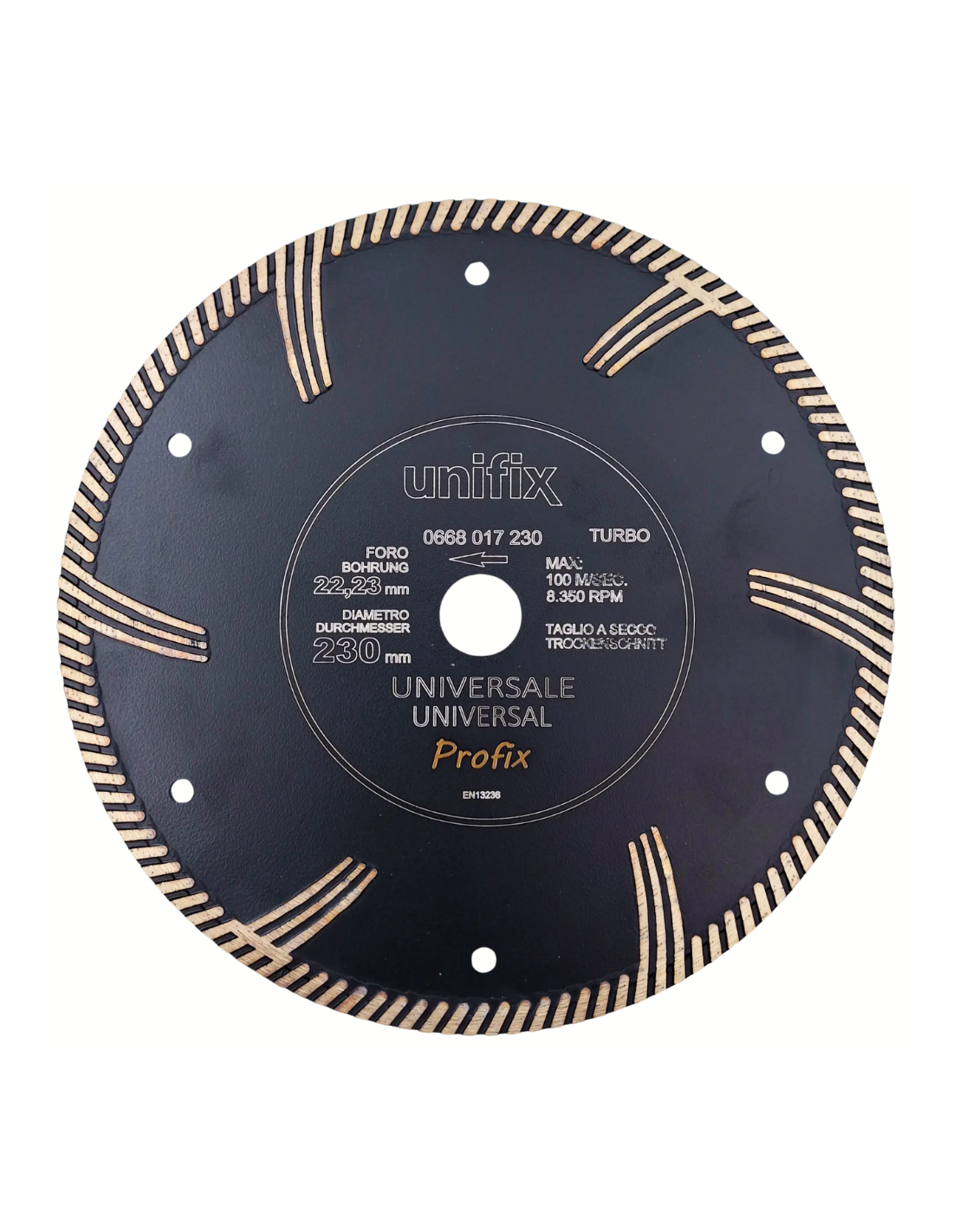 Il disco diamantato turbo universale rappresenta una soluzione altamente tecnologica per chi necessita di un utensile affidabile e duraturo nelle operazioni di taglio di materiali da costruzione. Progettato con una corona continua e segmenti diamantati di altezza 10 mm, questo disco è stato pensato per garantire tagli rapidi, netti e con una finitura pulita su una vasta gamma di superfici tra cui cemento armato, granito, ceramica, cotto, porfido, marmo e mattoni. Gli inserti laterali diamantati svolgono un ruolo fondamentale nel mantenere il taglio costantemente aperto, riducendo l’attrito e prevenendo il surriscaldamento dell’anima metallica. Questo contribuisce a preservare le caratteristiche meccaniche del disco anche dopo molte ore di impiego intensivo. La struttura rinforzata in acciaio speciale temperato conferisce al disco un’elevata resistenza alla deformazione e agli urti accidentali, mentre la distribuzione omogenea dei diamanti industriali nei segmenti assicura performance costanti e affidabili nel tempo.