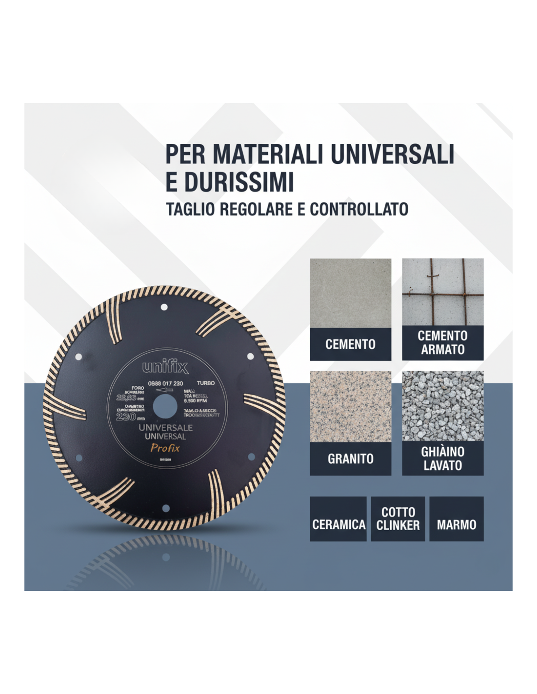 - Versatilità totale: ideale per una moltitudine di materiali da costruzione come cemento armato, granito, ceramica, cotto, porfido, marmo naturale o artificiale, mattoni pieni o forati, clinker, poroton e ghiaino lavato. Questa ampia compatibilità consente ai professionisti di ridurre il numero di utensili necessari in cantiere.