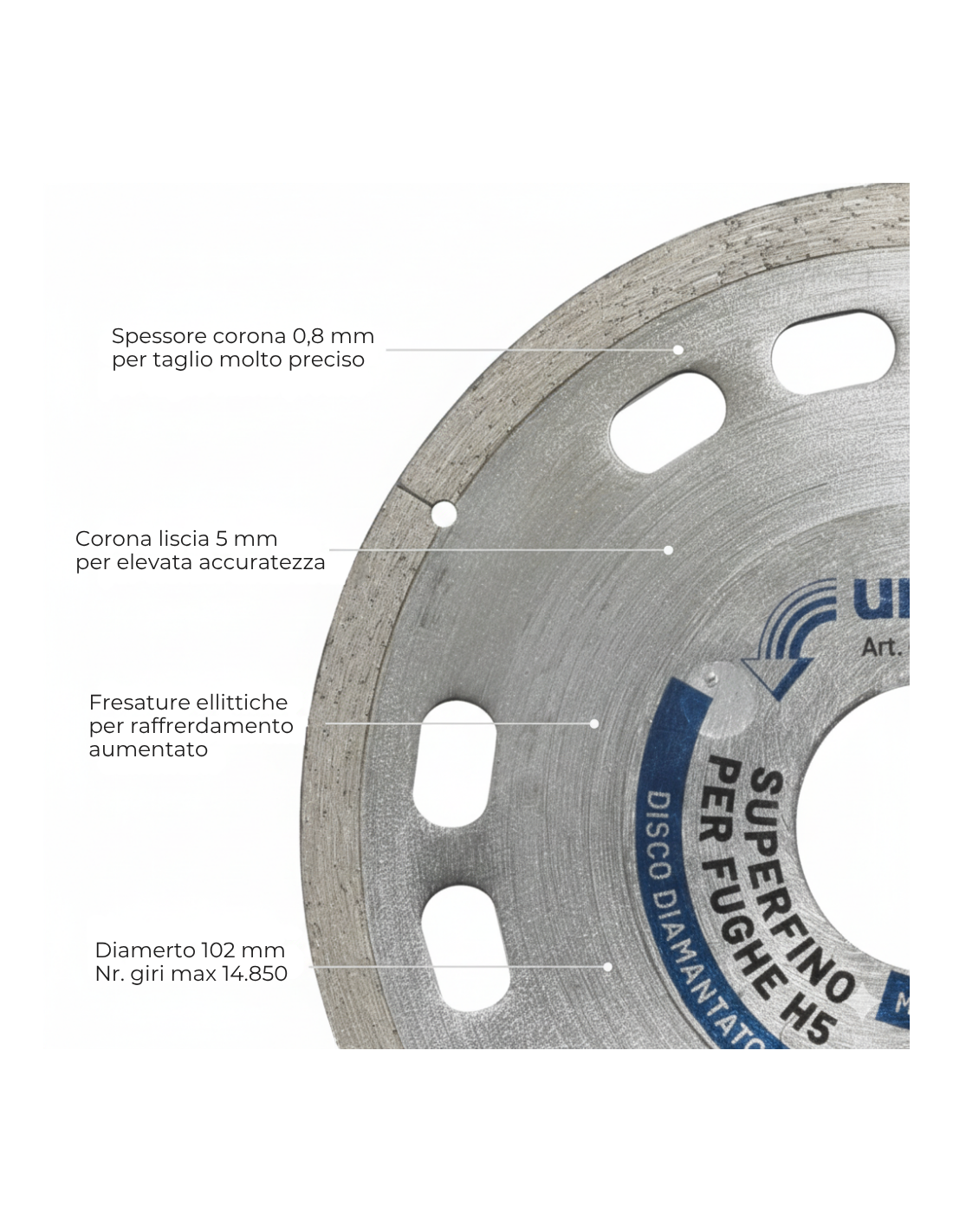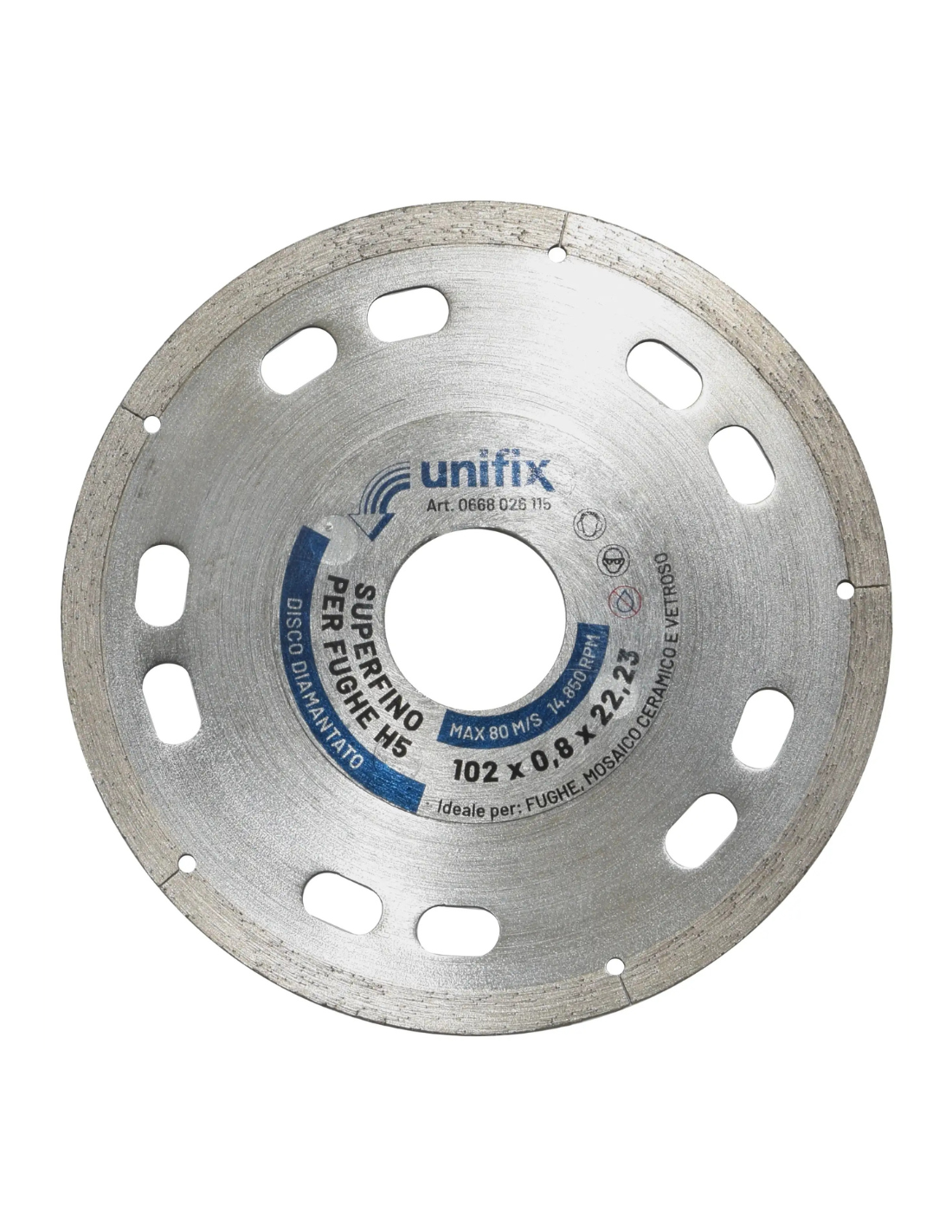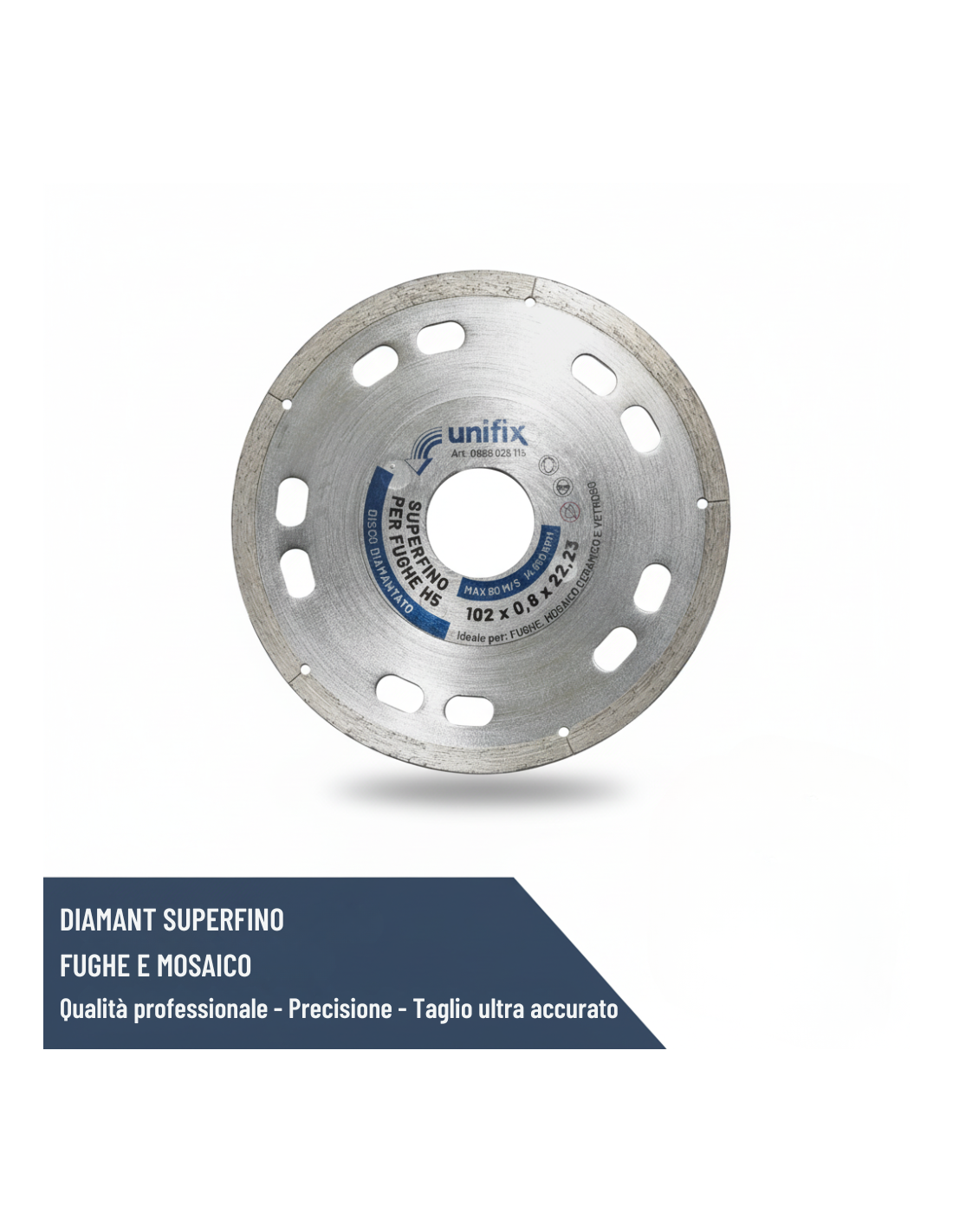 Il disco diamantato Diamant superfino è una soluzione d’eccellenza progettata per il taglio preciso di fughe e mosaico in materiali ceramici e vetrosi. Questo utensile si distingue per le sue prestazioni elevate, grazie all’innovativa geometria della corona e alla struttura avanzata del disco. Con uno spessore della corona di soli 0.8 mm, permette di ottenere tagli estremamente precisi, mentre la larghezza liscia della corona di 5 mm offre stabilità durante le operazioni. Le fresature ellittiche sull’anima del disco sono state progettate per ottimizzare il raffreddamento, riducendo il rischio di surriscaldamento e prolungando la durata dell’utensile. Il diametro di 102 mm conferisce versatilità, rendendolo compatibile con una vasta gamma di macchine da taglio.