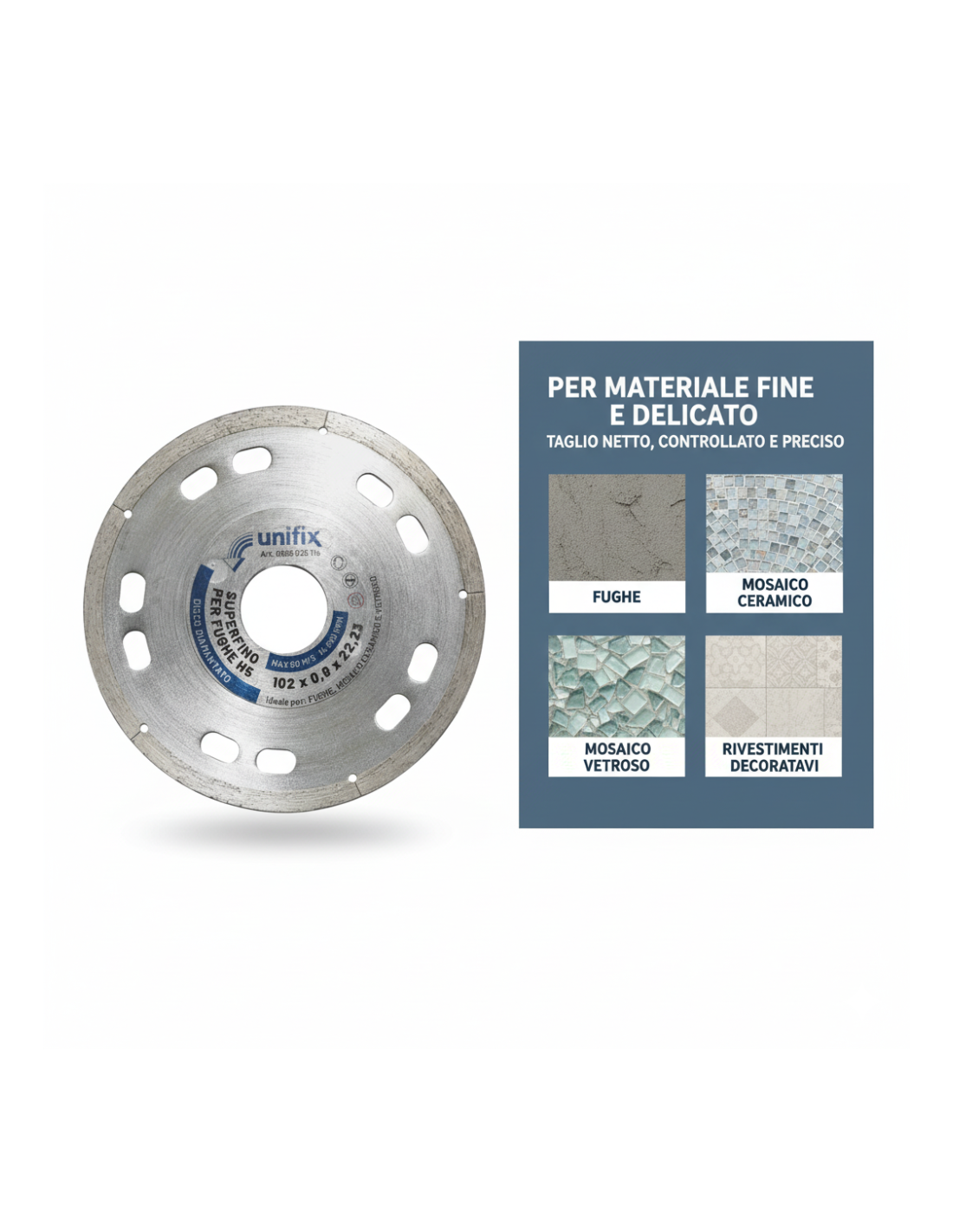 - Lavori su piccoli formati: il diametro contenuto rende questo disco indicato per interventi su tessere minute o spazi ristretti dove è necessaria manovrabilità.