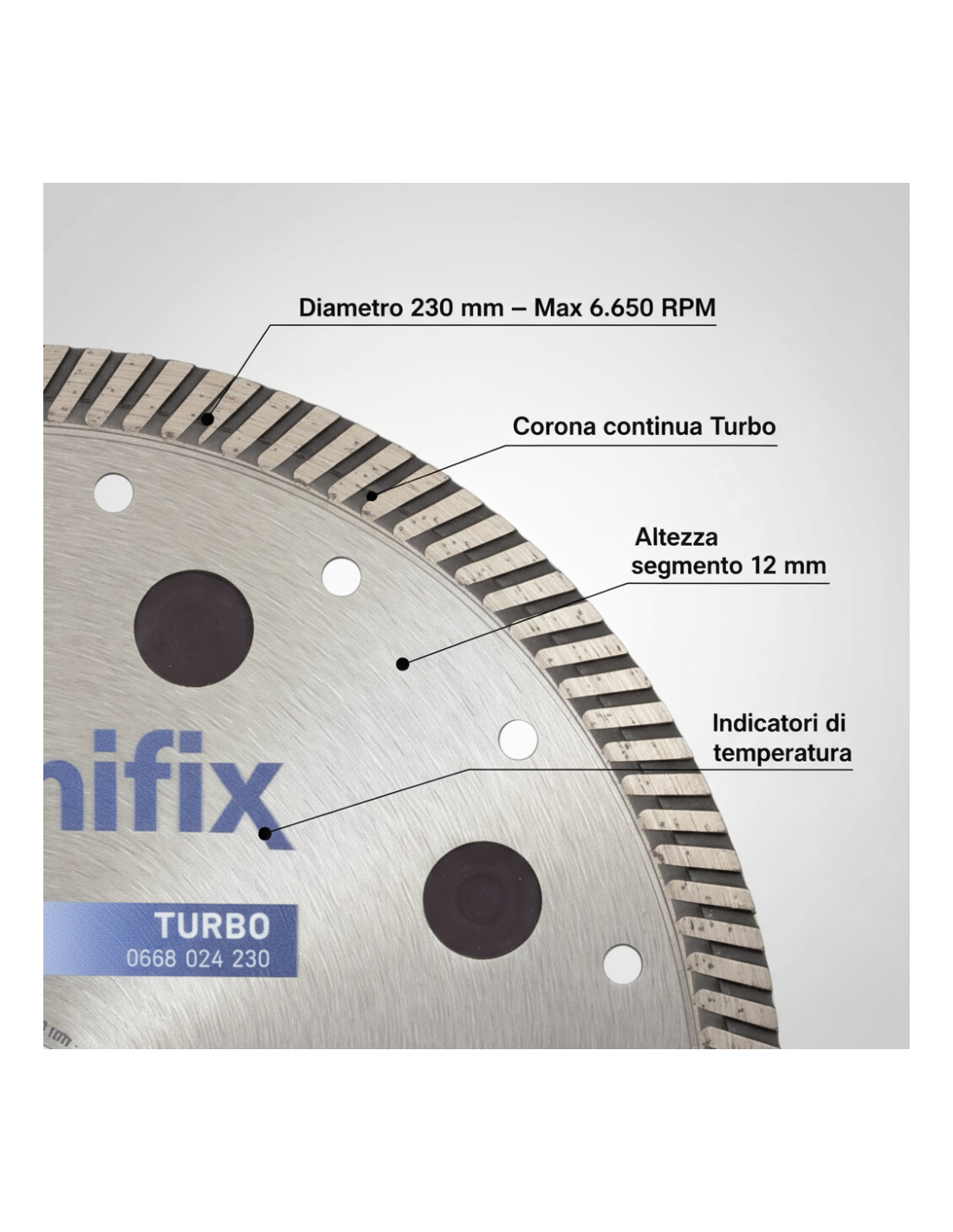 Il disco diamantato turbo X-Term è stato progettato per offrire una soluzione avanzata alle esigenze di taglio nel settore edile, sia per operatori professionali sia per utenti evoluti del fai-da-te. Dotato di una corona continua con profilo turbo e segmenti alti 12 mm, questo disco si avvale di una concentrazione elevata di polvere di diamante sintetico che ottimizza la resistenza all'usura e permette un taglio netto, preciso e rapido su materiali ad alta durezza o abrasività come cemento armato, granito, cotto, porfido e pietre naturali. La sua struttura integra otto sensori termocromici posizionati strategicamente lungo la circonferenza della corona: questi dispositivi innovativi rilevano in tempo reale il raggiungimento di temperature critiche durante l’utilizzo, cambiando colore in modo visibile e aiutando l’operatore a prevenire il surriscaldamento che potrebbe compromettere sia la sicurezza sia la vita utile del disco stesso.