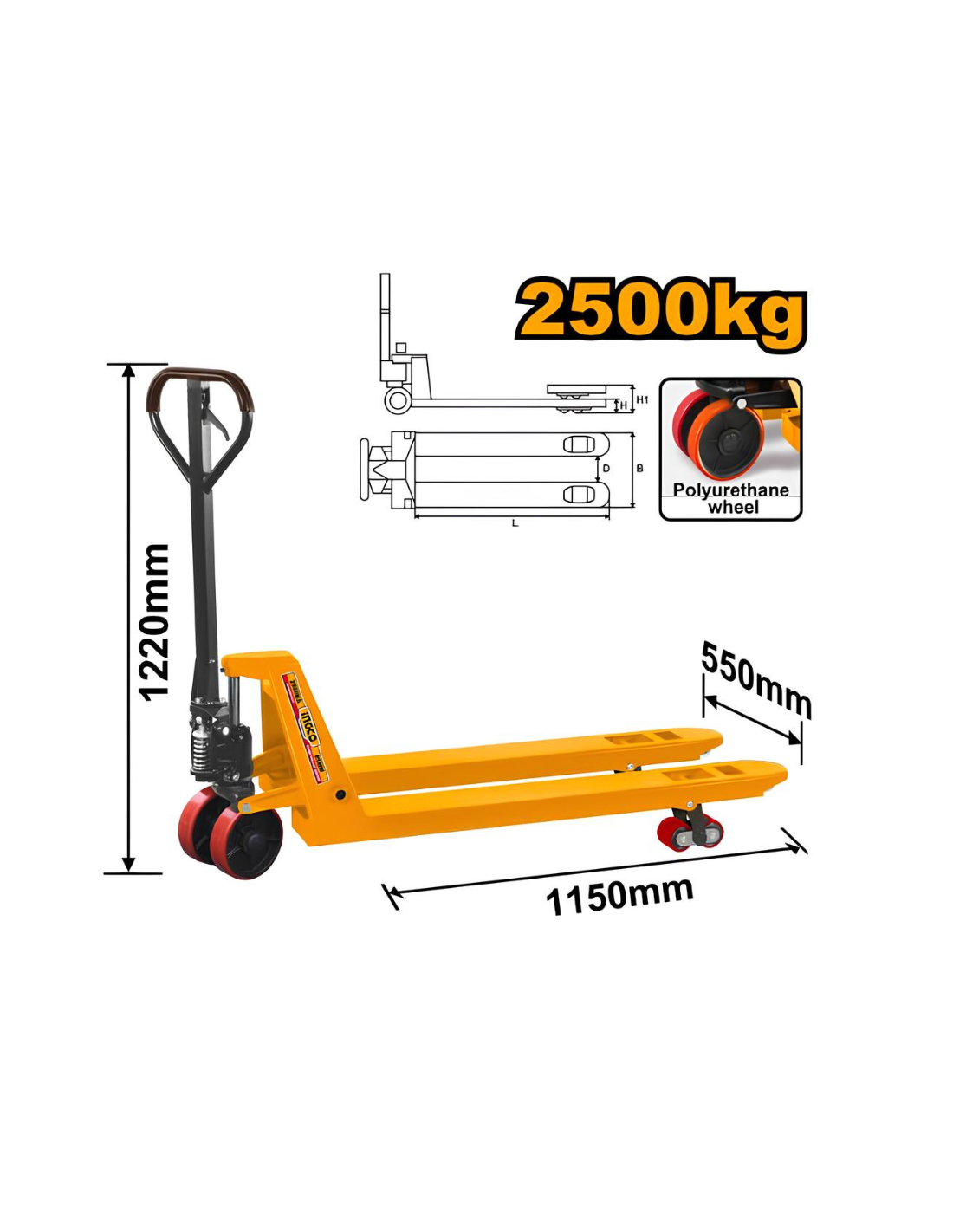 Transpallet Ingco Carico Max 2,5T Forche 550 x 1150 mm Colore Giallo Logistica